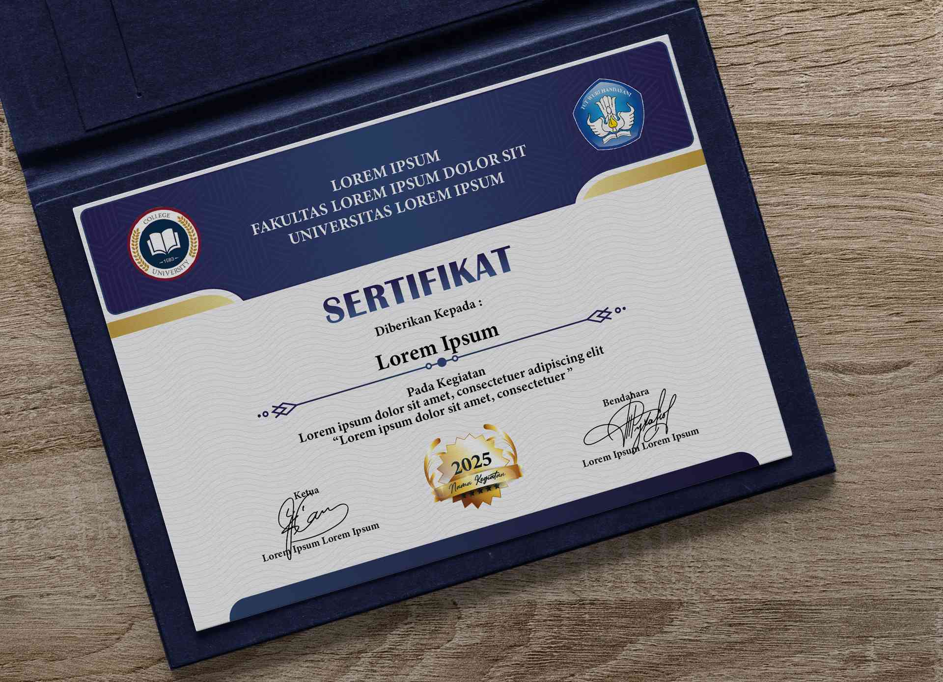 Sertifikat ini menampilkan desain yang elegan dan eksklusif dengan dominasi warna merah marun, putih, dan sentuhan emas yang memperkuat kesan prestisi...