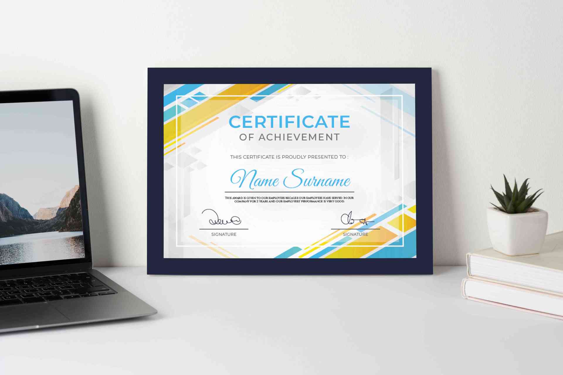 Mockup sertifikat ini menonjolkan tampilan segar dan kreatif dengan penggunaan warna pastel seperti oranye peach, pink, dan biru yang membentuk pola geometris unik di bagian atas dan bawah. Gaya desain ini cocok untuk institusi yang ingin menampilkan citra muda, inovatif, dan tidak terlalu kaku. Judul “Certificate of Achievement” disusun dalam dua jenis font yang harmonis, menonjolkan kata “Full Name” dengan huruf sambung biru yang elegan. Sertifikat ini ditampilkan dalam bingkai hitam dan diletakkan di atas meja minimalis, cocok untuk branding perusahaan modern, startup, ataupun institusi pelatihan dengan pendekatan dinamis.