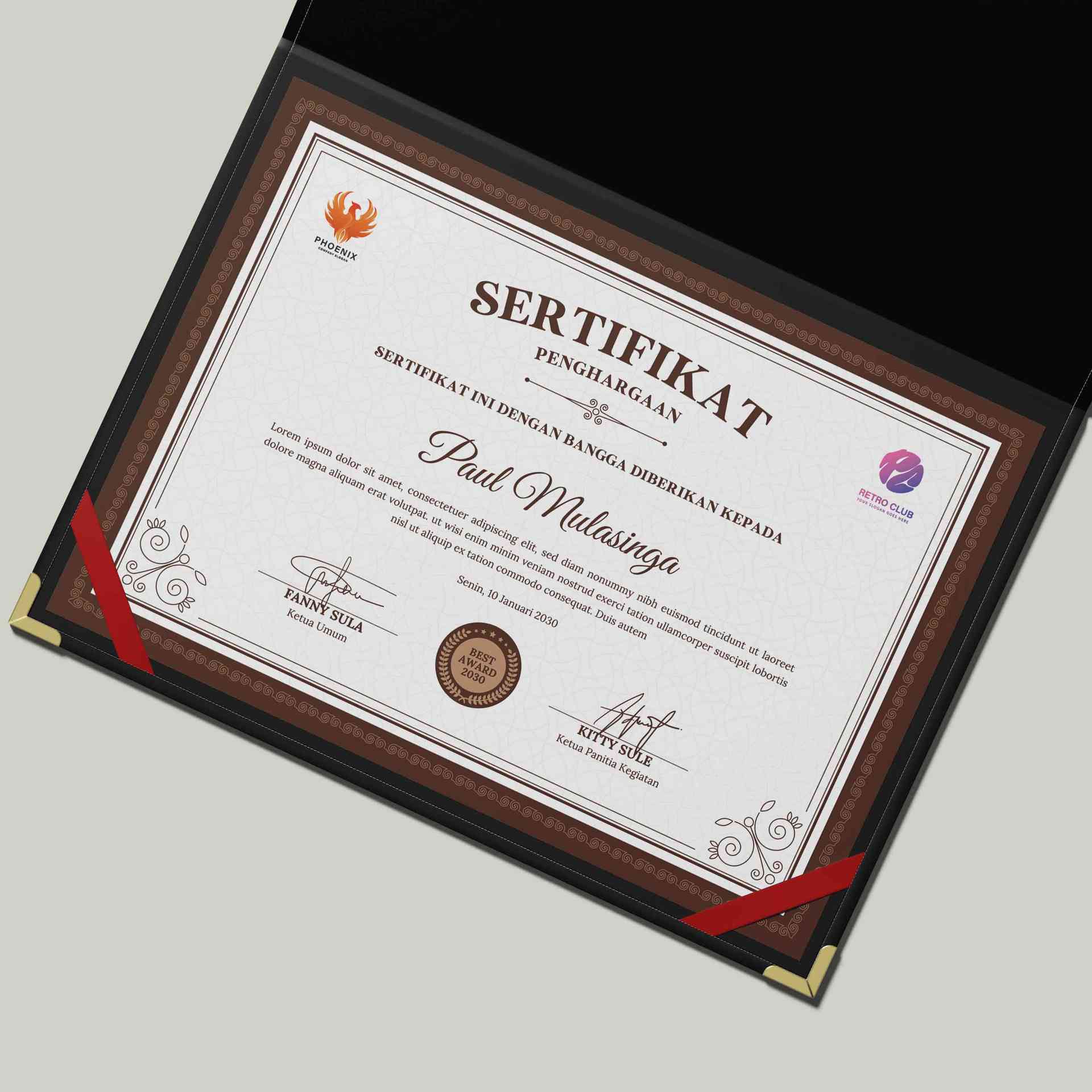 Sertifikat ini hadir dengan tampilan yang klasik, mewah, dan elegan β¨ berkat balutan bingkai motif cokelat bergaya vintage yang langsung memberikan ke...