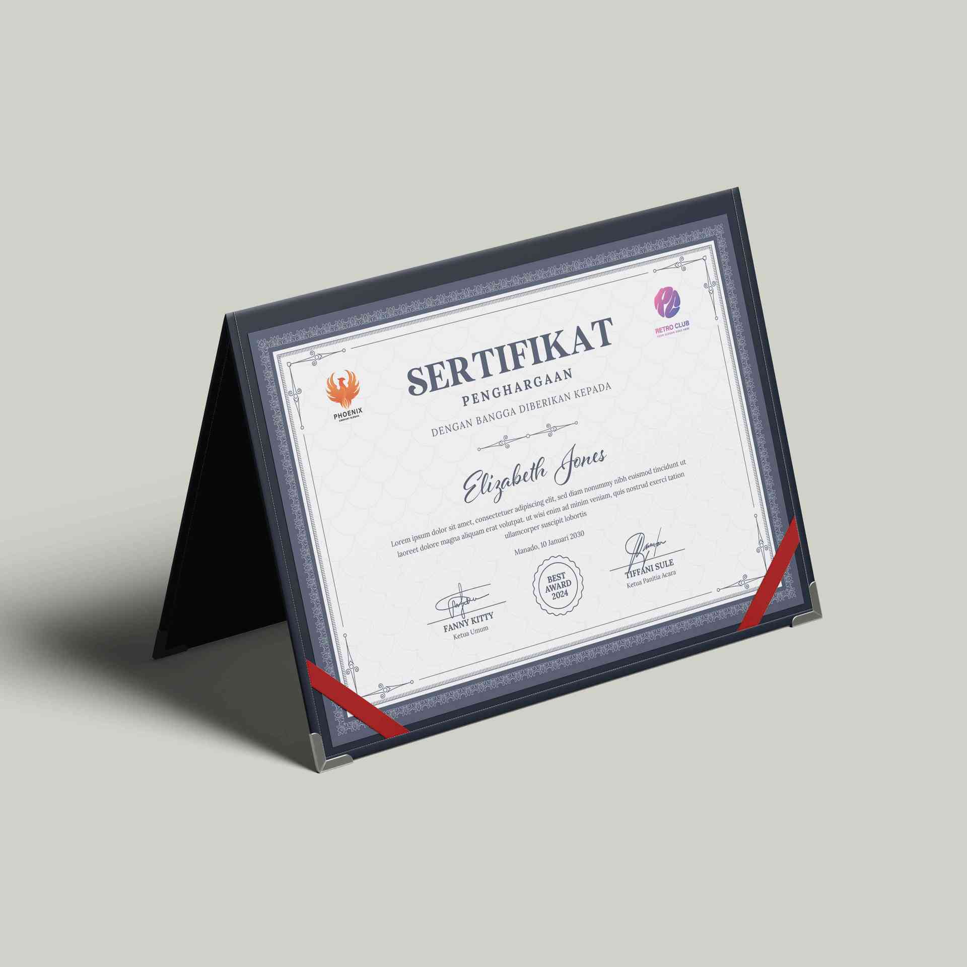 Sertifikat ini tampil dengan desain yang anggun dan resmi, dibingkai motif khas biru tua yang memberi kesan mewah, formal, dan sangat cocok digunakan...