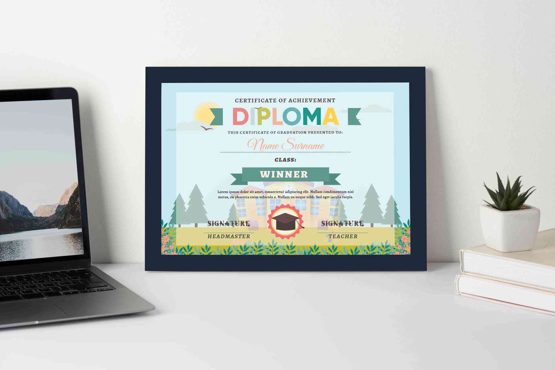 Desain sertifikat ini mengusung tema alam dengan ilustrasi pepohonan, burung, dan gedung sekolah yang diletakkan dalam bingkai pemandangan yang cerah...