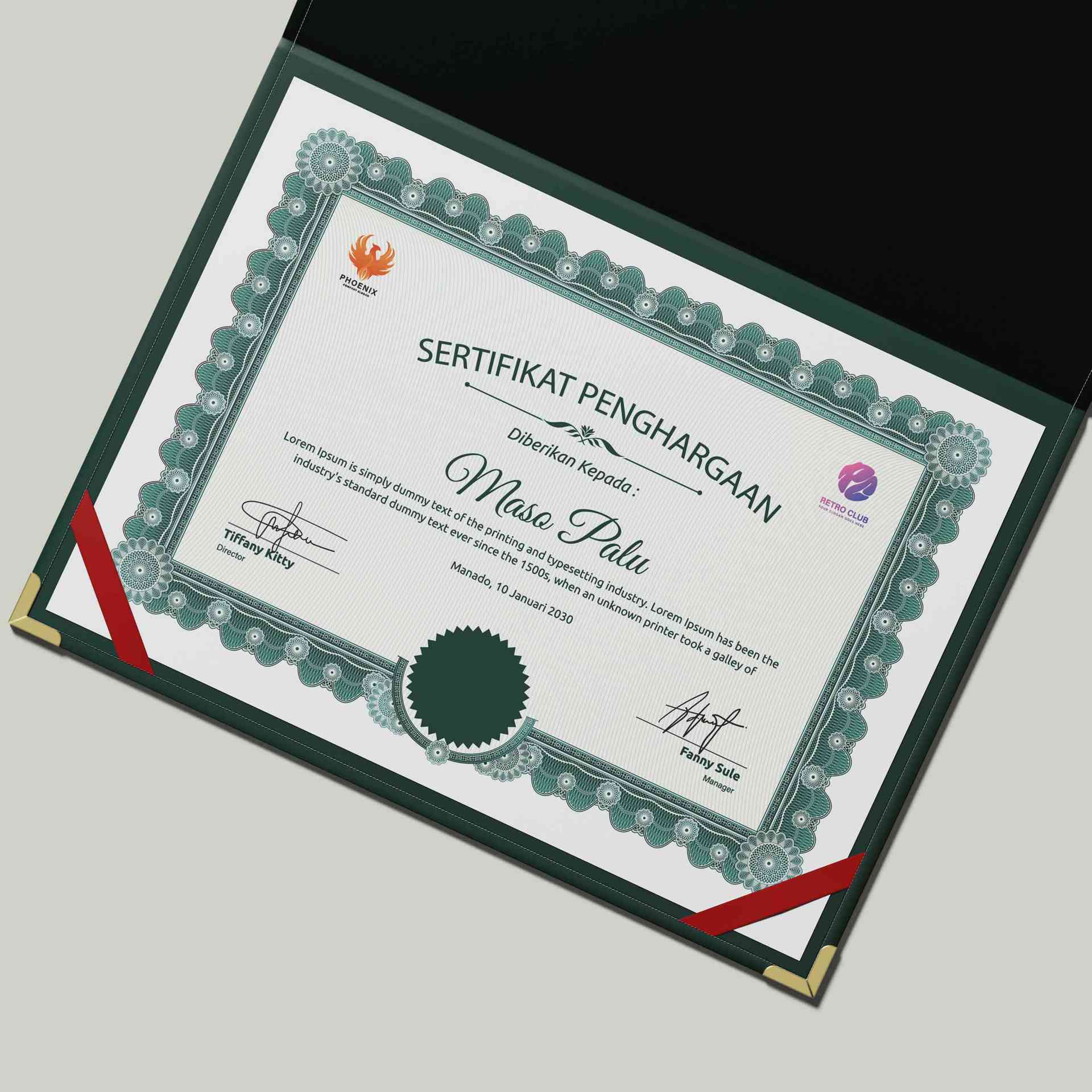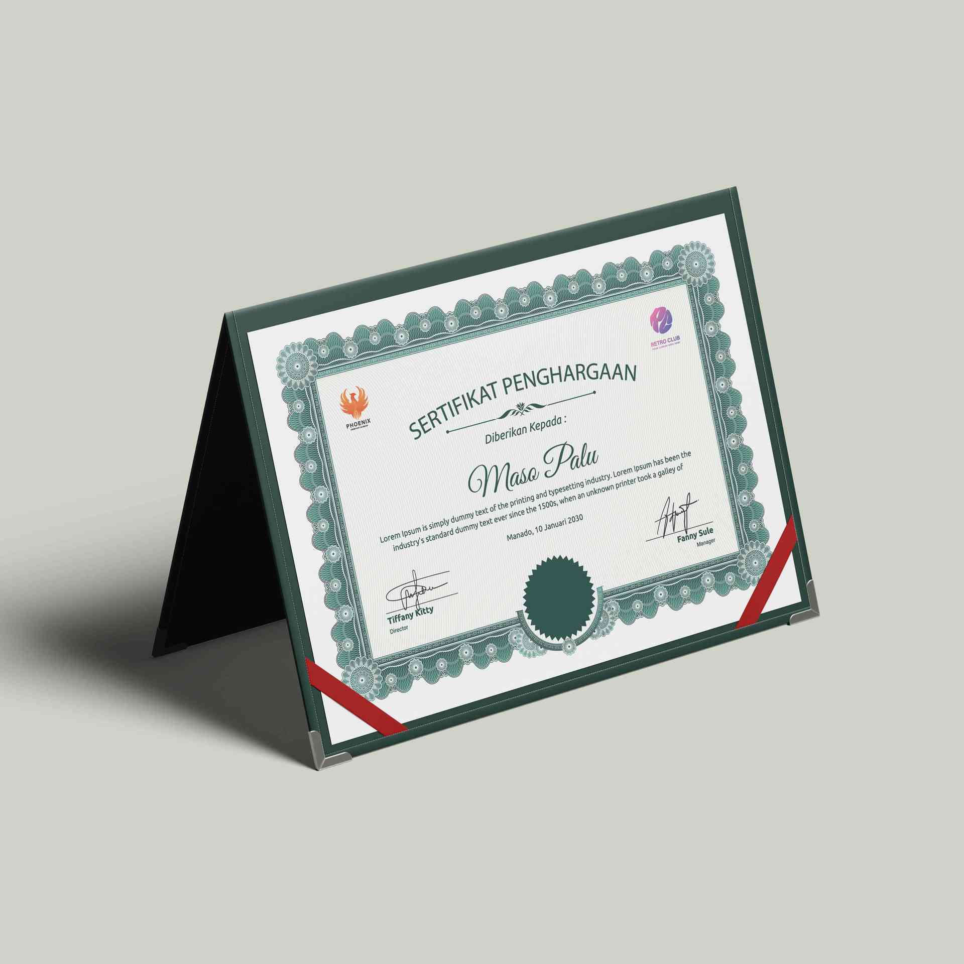 Sertifikat ini menampilkan desain yang elegan dan eksklusif dengan dominasi warna merah marun, putih, dan sentuhan emas yang memperkuat kesan prestisi...