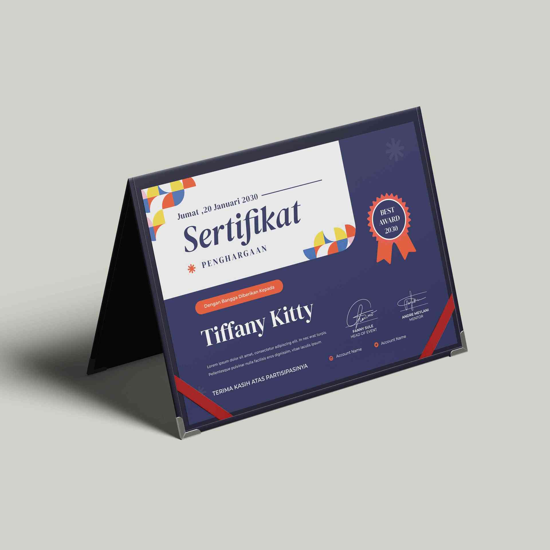 Desain sertifikat ini menampilkan tampilan yang minimalis namun mewah, dengan warna dominan putih dan aksen emas serta navy yang mencerminkan kesan pr...