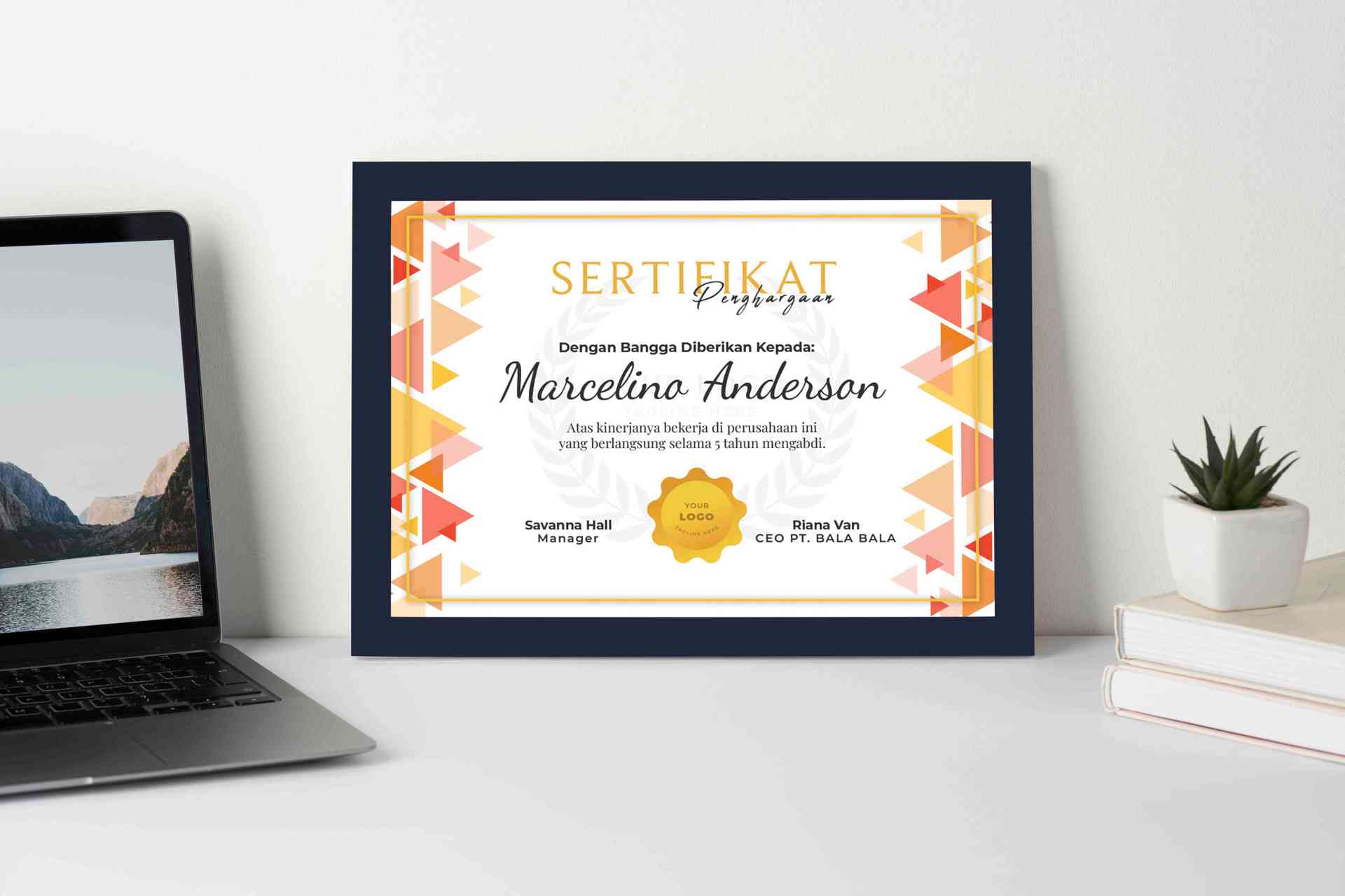 Desain sertifikat ini tampil memikat dengan sentuhan geometris yang modern dan palet warna pastel yang lembut namun tetap elegan. Cocok untuk perusaha...