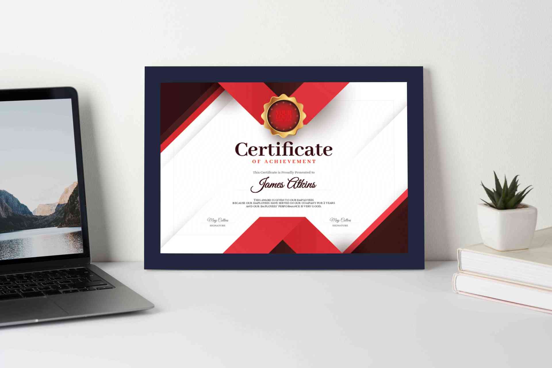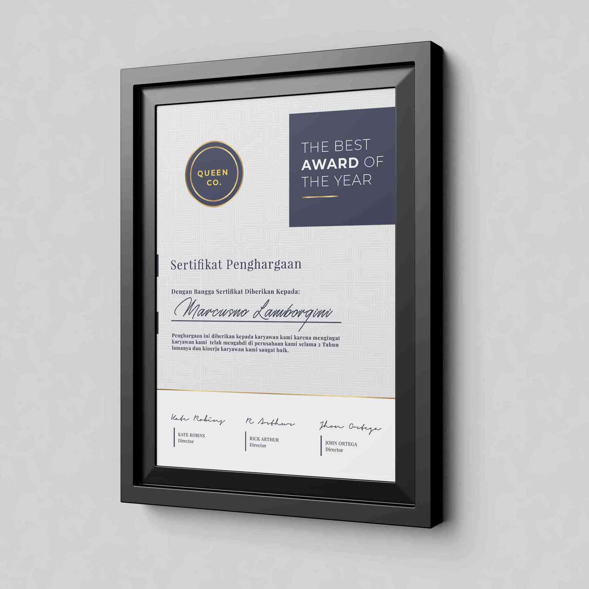 Sertifikat ini dirancang dengan nuansa kemewahan melalui kombinasi warna merah marun, biru tua, dan garis emas yang elegan. Medali berlabel "BEST AWARD" di tengah desain menonjolkan prestise penghargaan yang diberikan. Elemen geometris simetris yang dipadukan dengan efek bayangan memberikan kesan tiga dimensi dan eksklusif. Sertifikat ini sangat ideal untuk diberikan kepada karyawan sebagai bentuk apresiasi atas kontribusi dan dedikasi mereka dalam jangka waktu tertentu. Tampilannya tidak hanya profesional, tetapi juga penuh penghargaan dan kebanggaan.