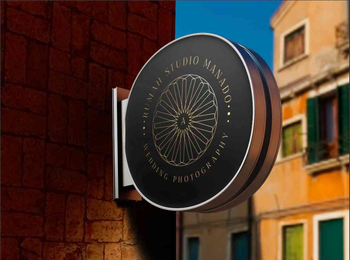Sign box berbentuk bulat dengan dominasi warna hitam dan aksen garis serta tulisan berwarna emas, menampilkan desain elegan dan modern. Visual utama b...