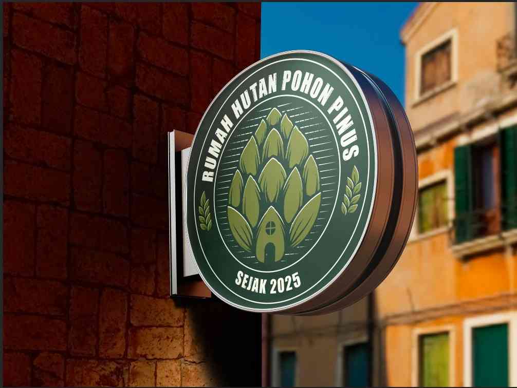 Desain sign box ini menampilkan logo Rumah Hutan Pohon Pinus dengan nuansa hijau alami dan vintage, menghadirkan ilustrasi rumah kecil berbentuk pinus...