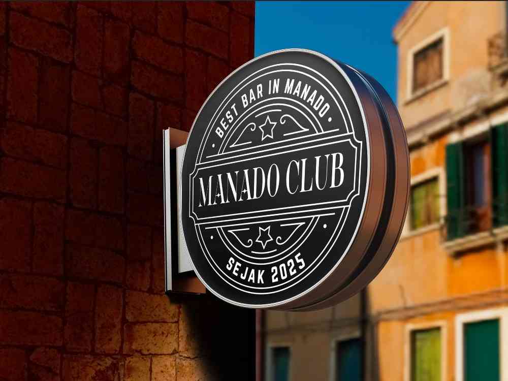 Desain sign box ini menghadirkan logo Manado Club dengan gaya badge klasik berwarna hitam putih yang elegan dan maskulin. Di bagian atas tertulis “BES...