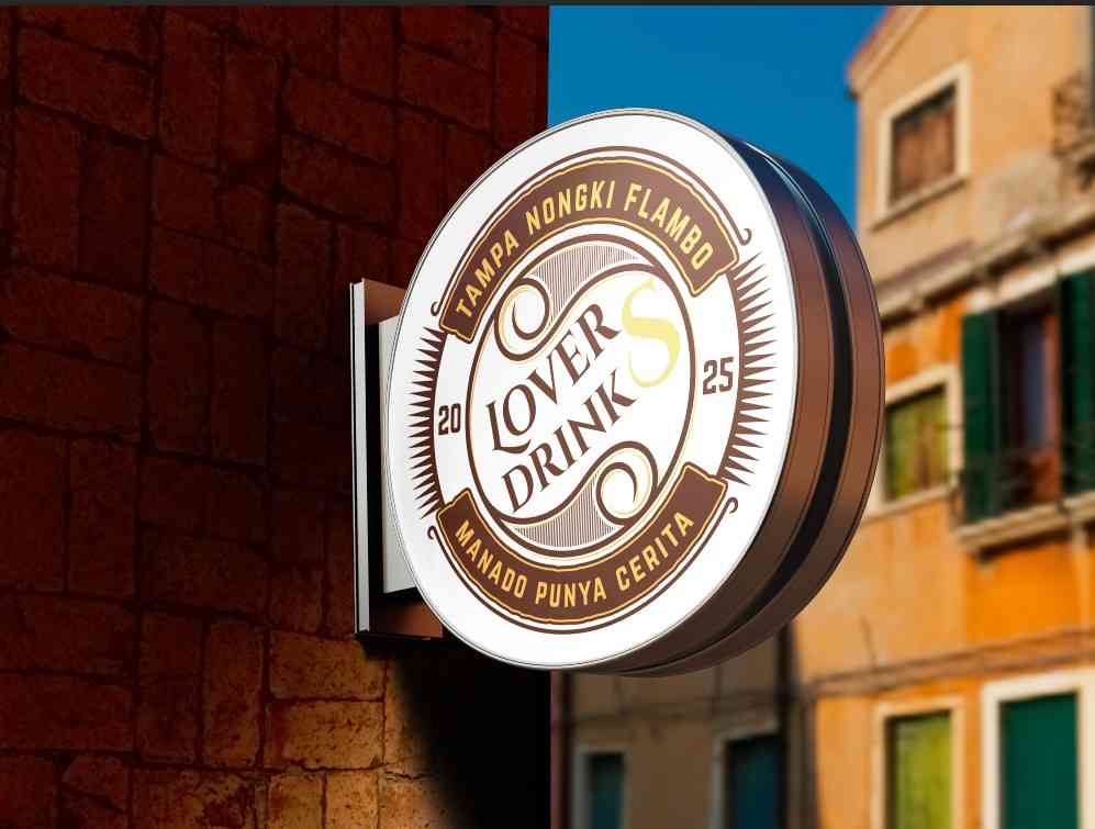 Desain sign box ini menampilkan logo Lovers Drinks dengan gaya vintage yang unik, menggunakan kombinasi warna coklat tua, emas, dan putih yang memberi...