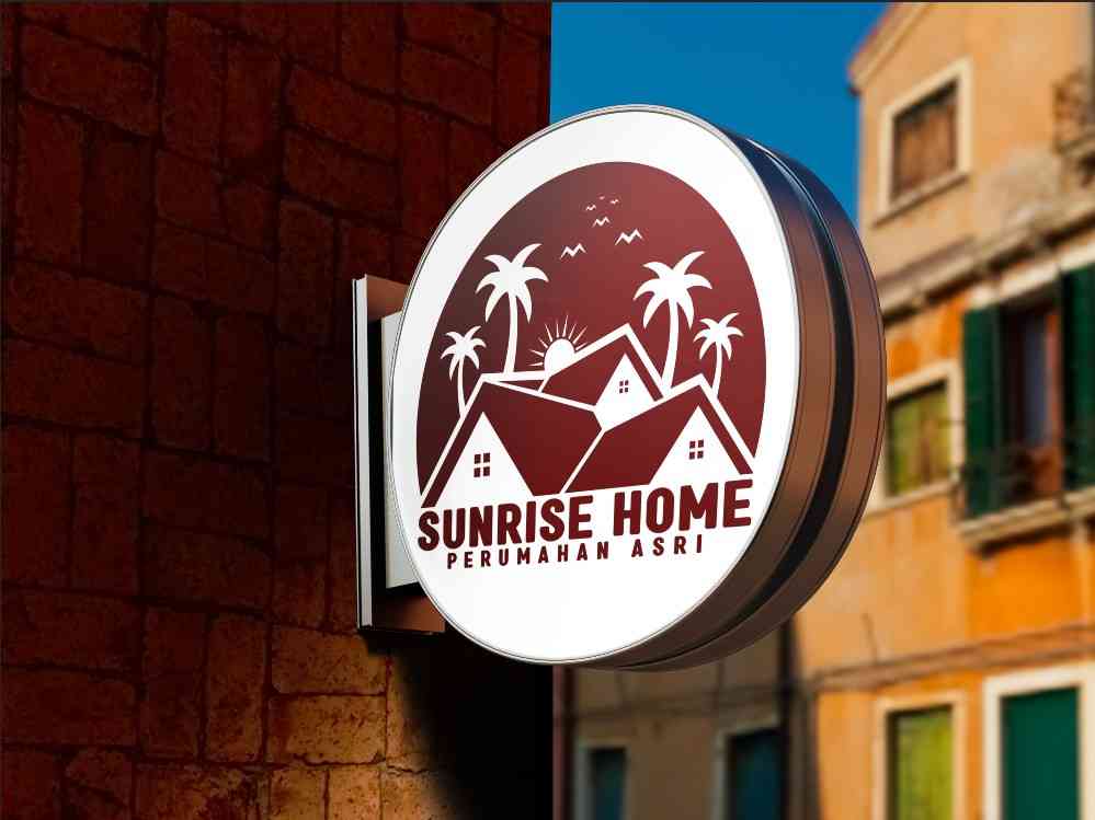 Desain sign box ini menampilkan logo Sunrise Home Perumahan Asri dengan ilustrasi rumah-rumah beratap segitiga yang tersusun harmonis, diiringi mataha...