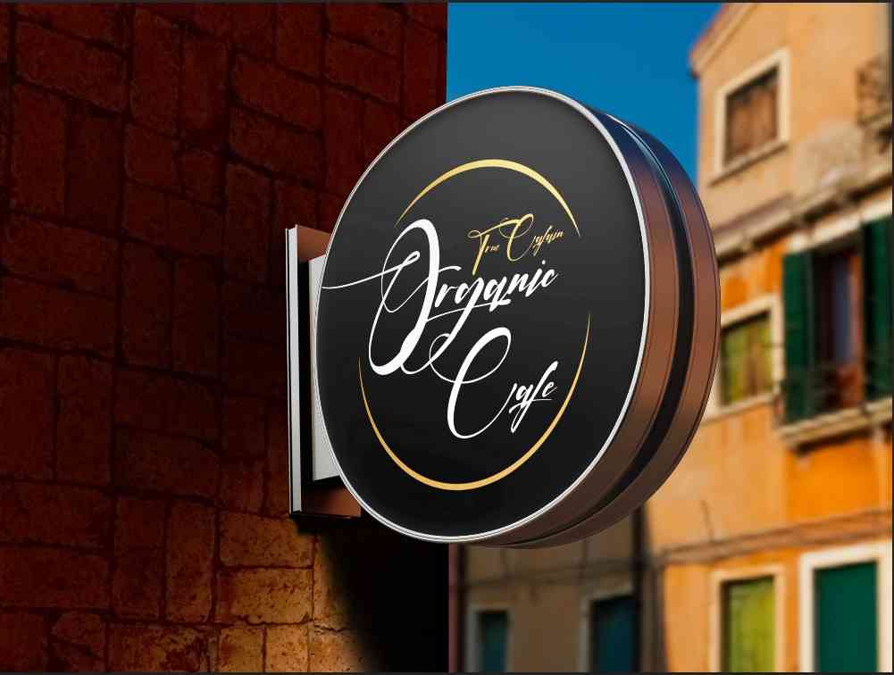 Sign Box berbentuk bulat dengan warna dominan hitam dan aksen emas menampilkan tulisan “Organic Cafe” dengan gaya huruf skrip putih yang elegan, membe...