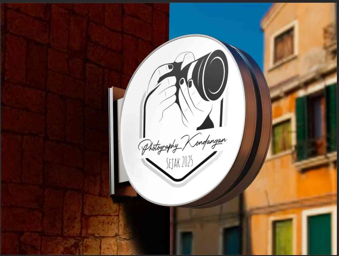 Sign Box berbentuk lingkaran dengan dominasi warna putih dan garis tepi gelap, menampilkan ilustrasi tangan memegang kamera, memperkuat identitas visu...