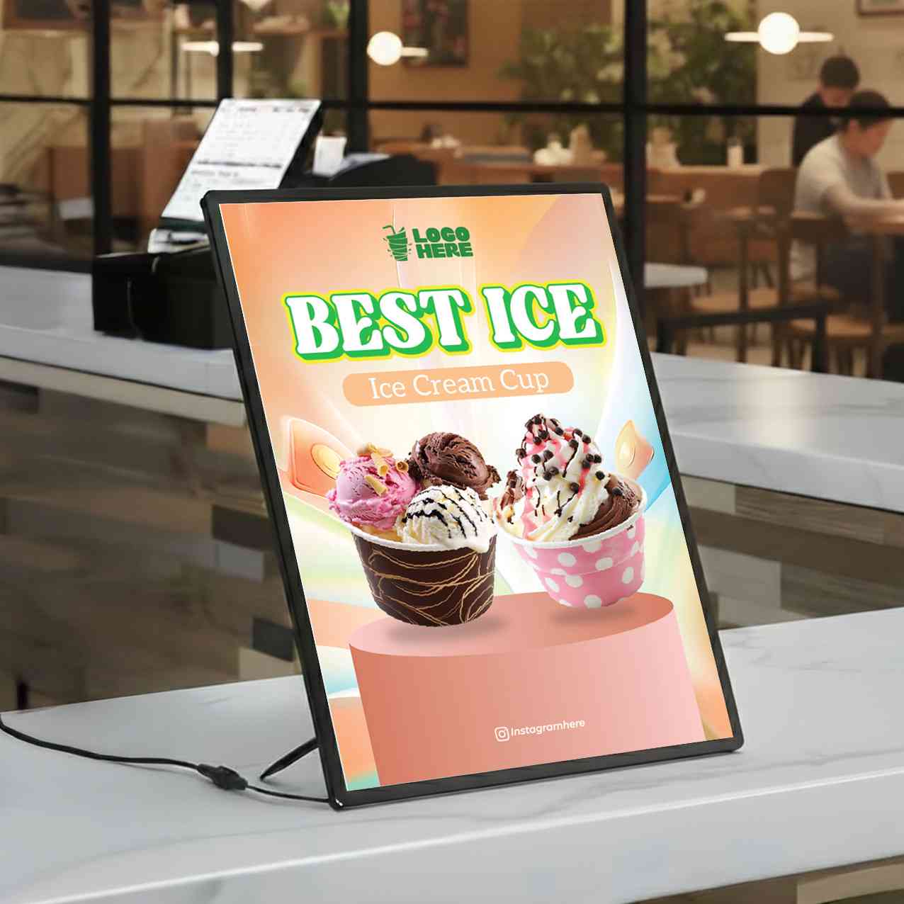Slim LED Menu dengan tema es krim ini memiliki bentuk persegi panjang dengan desain visual yang menarik, memajang gambar es krim stroberi sebagai kara...
