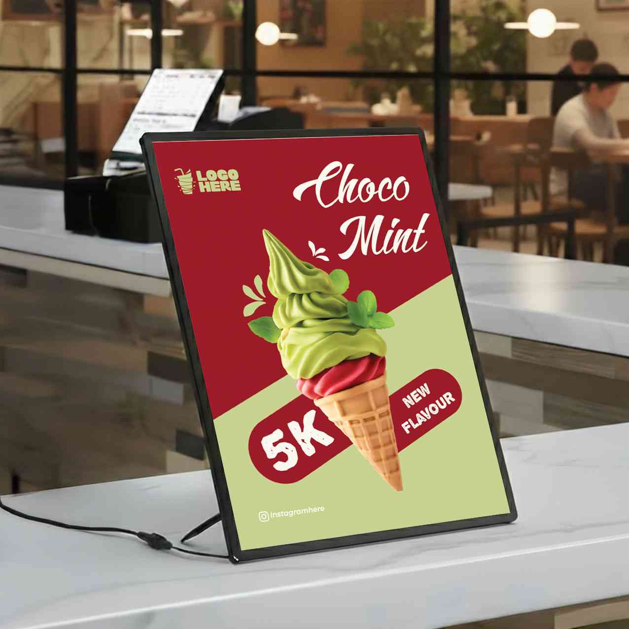 Slim LED Menu merupakan papan menu digital berbentuk persegi panjang tipis dengan bingkai hitam yang menampilkan visual es krim cone rasa mangga secar...
