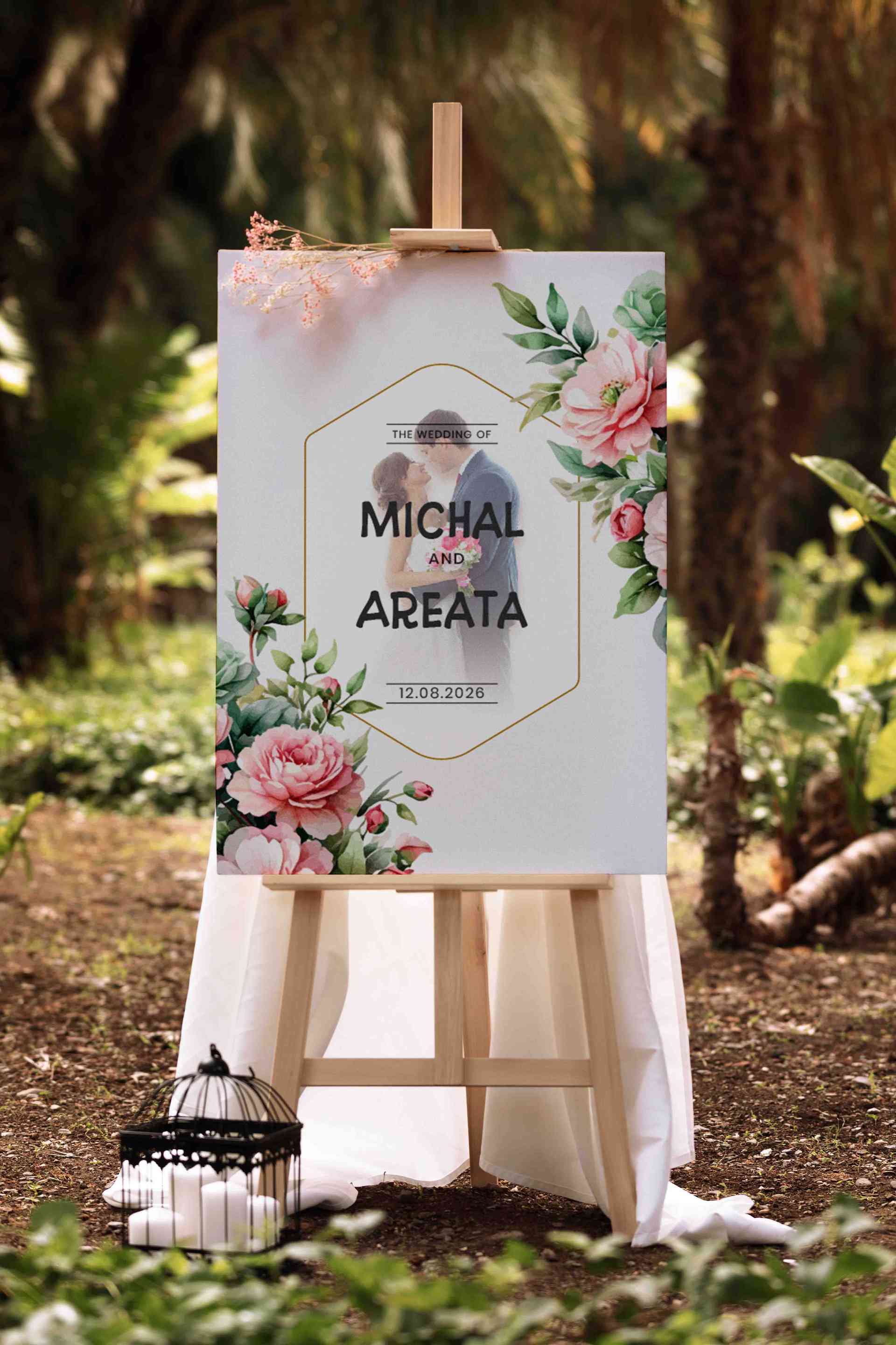 Welcome Wedding Sign elegan berbentuk persegi panjang vertikal dengan dominasi warna putih, dihiasi ilustrasi bunga peony pink dan hijau di sudut kana...