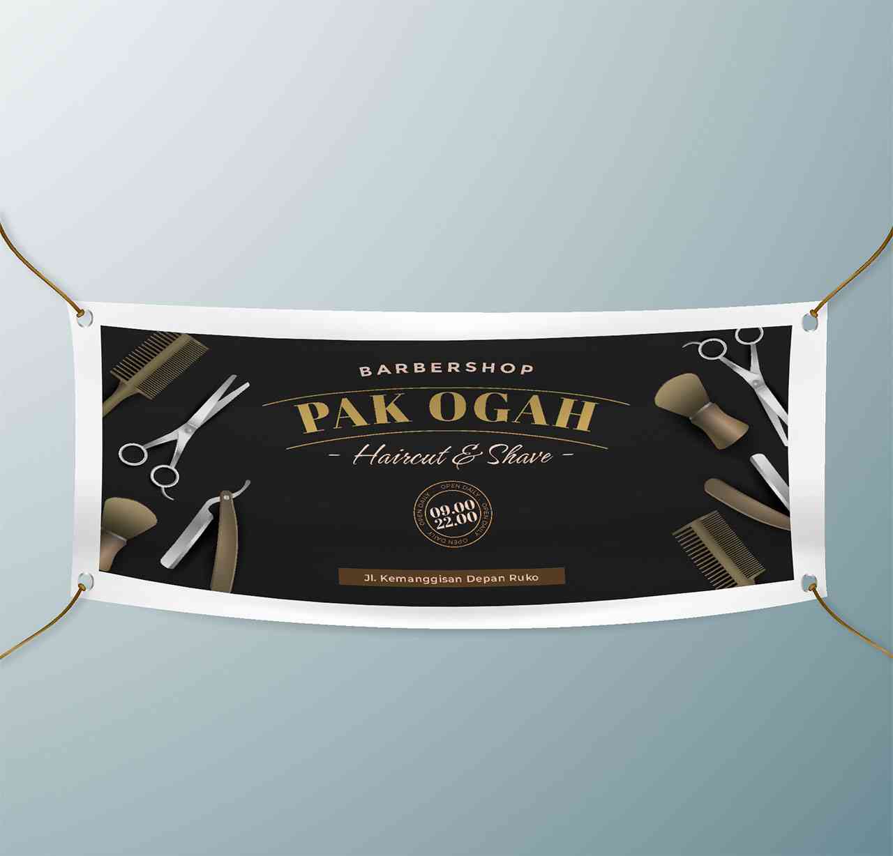 Banner untuk barbershop Pak Ogah yang menyuguhkan pelayanan cukur dan shave terbaik. Desain elegan dengan informasi waktu operasional serta lokasi yan...