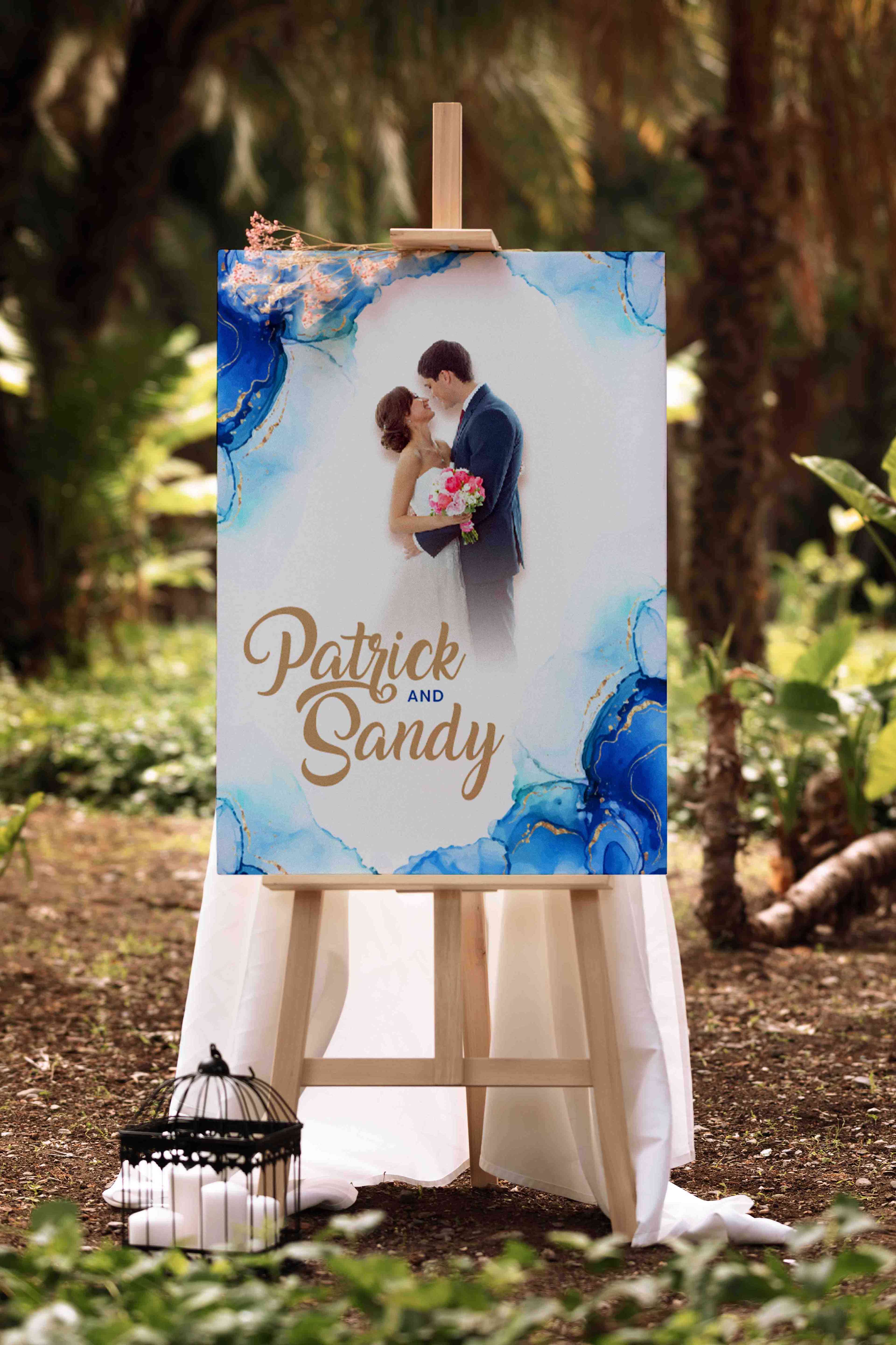Wedding Welcome Sign Nuansa Blue Gold berbentuk persegi panjang, menampilkan ilustrasi pasangan pengantin yang saling menatap dengan latar beraksen ma...