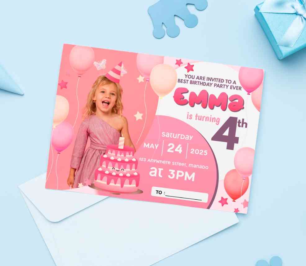 Undangan ulang tahun ini didesain dengan tema girly yang manis dan ceria, dominan warna pink pastel yang lembut. Di sisi kiri terlihat foto seorang an...