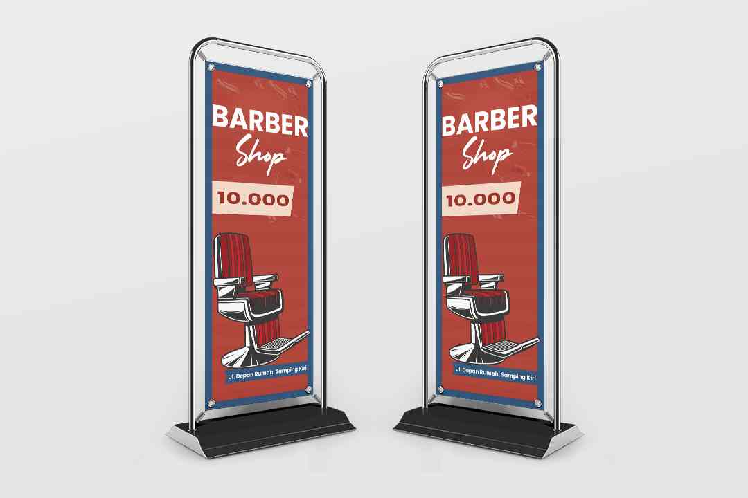 Banner promosi cetak untuk barber shop ini berbentuk vertikal dengan dominasi warna merah marun dan aksen biru di bagian tepi. Desain visual utama men...