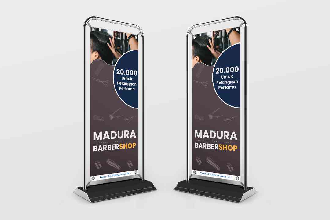 Banner Madura Barber merupakan media promosi berukuran vertikal dengan dominasi warna gelap seperti biru tua dan aksen kuning serta putih. Desain bann...