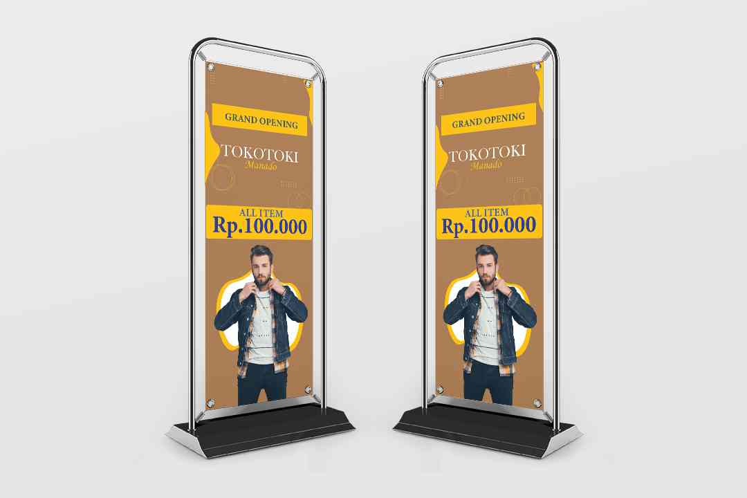 Banner promo grand opening toko baju berbentuk vertikal dengan dominasi warna coklat, kuning, dan putih, menampilkan visual utama seorang pria berbusa...