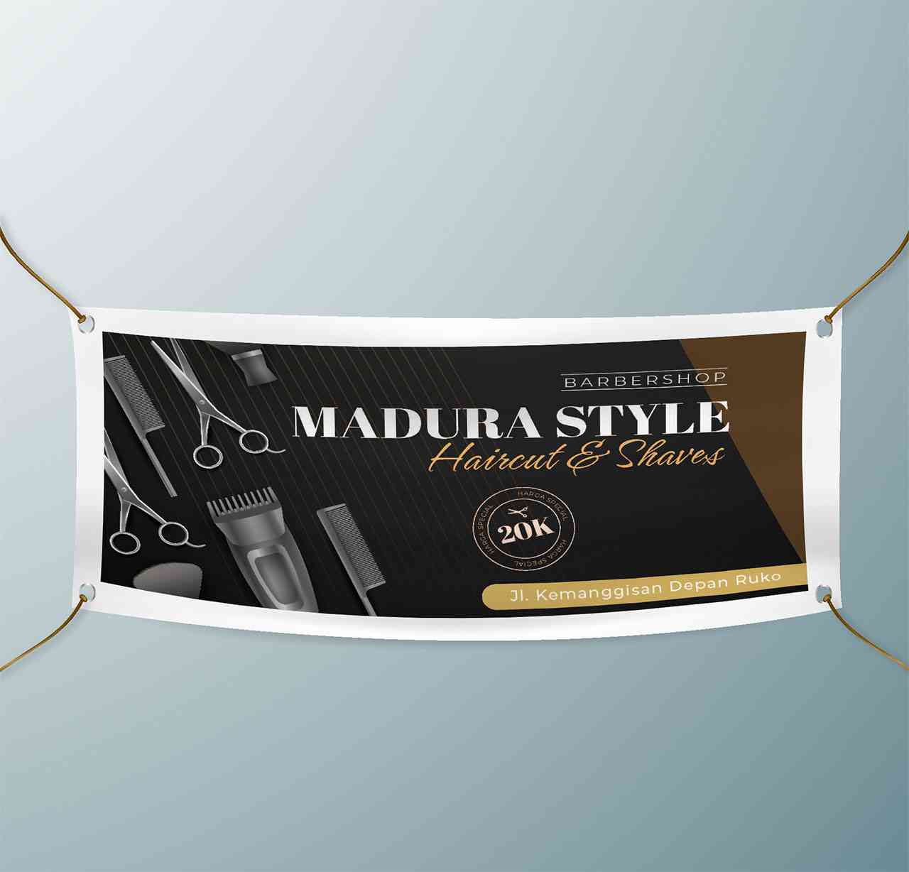 Banner Madura Style Barber Shop menawarkan layanan pemotongan dan cukur rambut dengan harga terjangkau hanya 20K. Desain banner ini menampilkan elemen...
