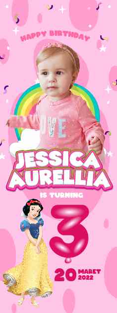 Spanduk berdiri ini adalah pintu gerbang menuju dunia dongeng yang memikat, di mana keajaiban dan keanggunan bertemu dalam perayaan ulang tahun seorang putri. Di tengah-tengah spanduk, tergambar seorang putri muda yang tersenyum manis, mengenakan gaun yang anggun dengan detail-detail berkilauan yang mempesona. Di sekelilingnya, istana-istana megah dan kebun-kebun bunga yang indah memberikan latar belakang yang mengesankan.