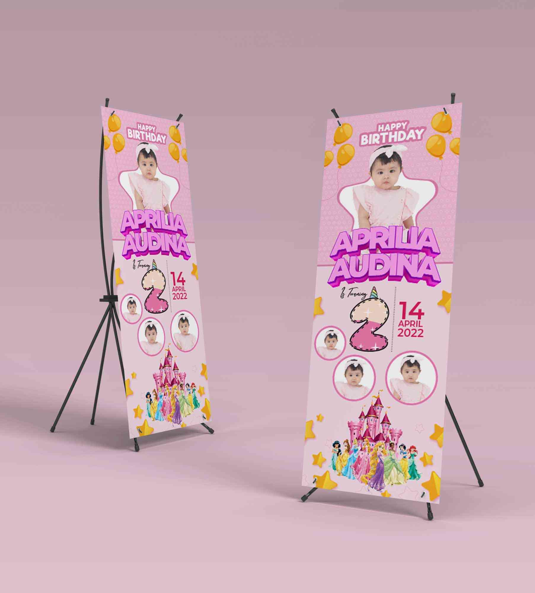 Langkahlah ke dalam dunia dongeng yang penuh keindahan dengan spanduk berdiri ini, di mana sebuah perayaan ulang tahun bertema princess sedang menanti. Di tengah-tengahnya, seorang putri muda tersenyum manis, mengenakan gaun berkilauan yang mempesona, dikelilingi oleh keindahan alam yang memikat, termasuk istana-istana megah dan taman-taman yang dipenuhi bunga-bunga yang indah.