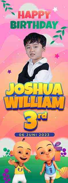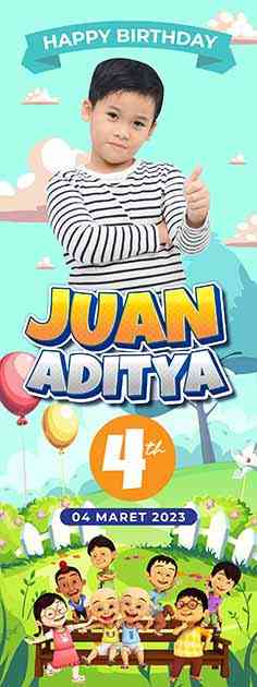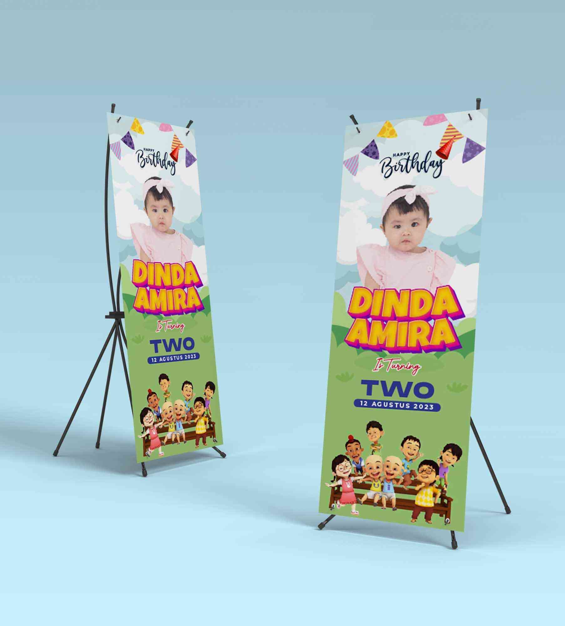 "Selamat datang di pesta ulang tahun yang penuh warna dengan tema Upin Ipin! Standing banner ini menjadi sorotan utama dengan gambar besar Upin dan Ipin yang lucu dan menggemaskan, dikelilingi oleh motif-motif ceria dari dunia animasi mereka. Latar belakang yang cerah dan berwarna-warni menambahkan sentuhan magis pada perayaan ini, sementara tulisan besar yang menyambut memastikan semua tamu merasa excited dan terlibat dalam keseruan hari istimewa ini. Standing banner ini tidak hanya mempercantik ruang perayaan, tetapi juga membangkitkan semangat kebahagiaan dan keceriaan anak-anak dalam suasana yang menyenangkan dan menggembirakan."