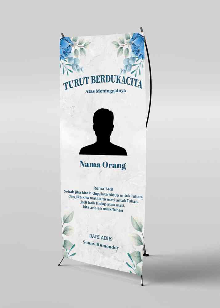 Baliho duka dengan tema langit biru memiliki kesan yang tenang, penuh harapan, dan serasi dengan alam. Desain baliho ini memanfaatkan dominasi warna biru yang melambangkan kedamaian dan ketenangan, menciptakan suasana yang penuh penghormatan dan refleksi. Di tengah langit biru yang luas, biasanya terdapat gambar burung terbang atau awan putih yang menggambarkan perjalanan jiwa yang menuju tempat yang lebih baik. Pada bagian tengah atau sisi baliho, akan tertera teks atau pesan duka cita dengan huruf yang elegan dan mudah dibaca. Teks ini bisa disertai dengan simbol-simbol keagamaan atau ornamen yang menambah kesan sakral dan khidmat. Langit biru yang lebar dan terang, meskipun digunakan dalam konteks duka, memberikan nuansa positif bahwa kehidupan berlanjut, dan yang telah berpulang akan selalu dikenang dengan penuh kasih sayang. Baliho ini tidak hanya menyampaikan pesan duka, tetapi juga memberi rasa ketenangan kepada yang melihatnya, seakan mengajak untuk merenung dan menerima dengan hati yang lapang.