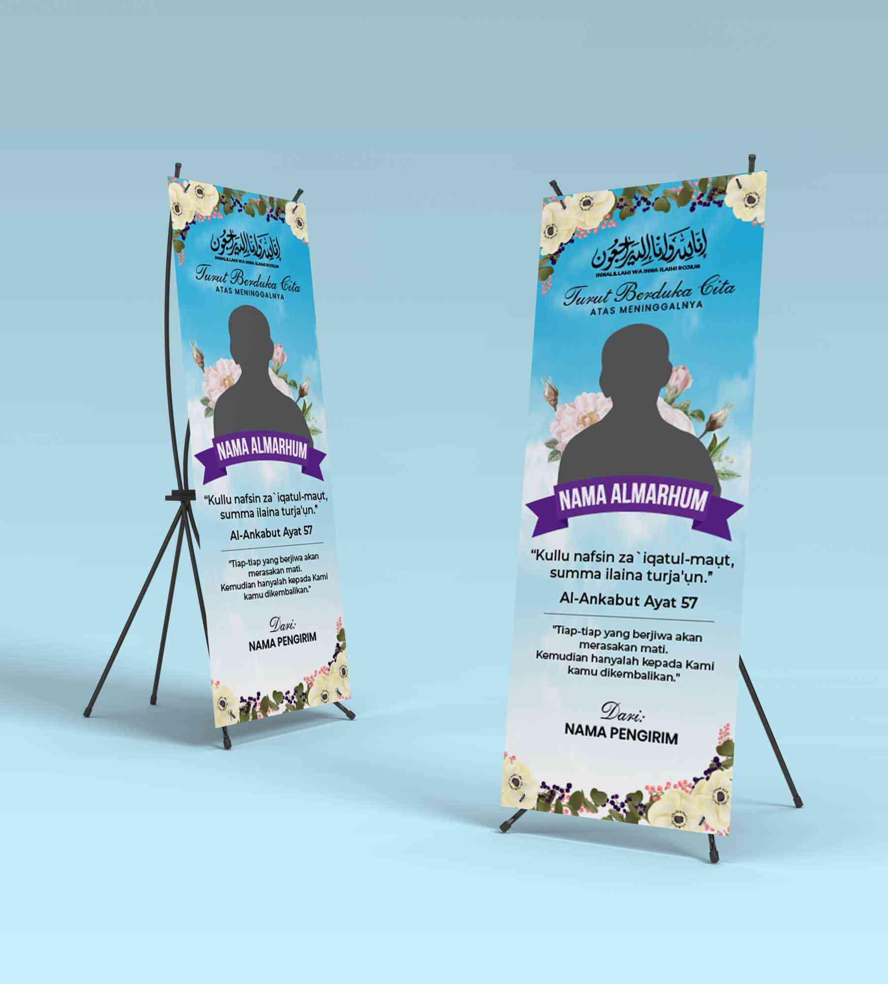Tema "Kedamaian Abadi" mengusung nuansa yang tenang dan penuh penghormatan untuk mengenang kepergian seseorang dengan elegan dan damai. Banner ini dirancang untuk menciptakan suasana yang menghibur sekaligus penuh ketenangan, mencerminkan rasa duka cita yang mendalam dan doa untuk kedamaian abadi bagi almarhum/almarhumah.