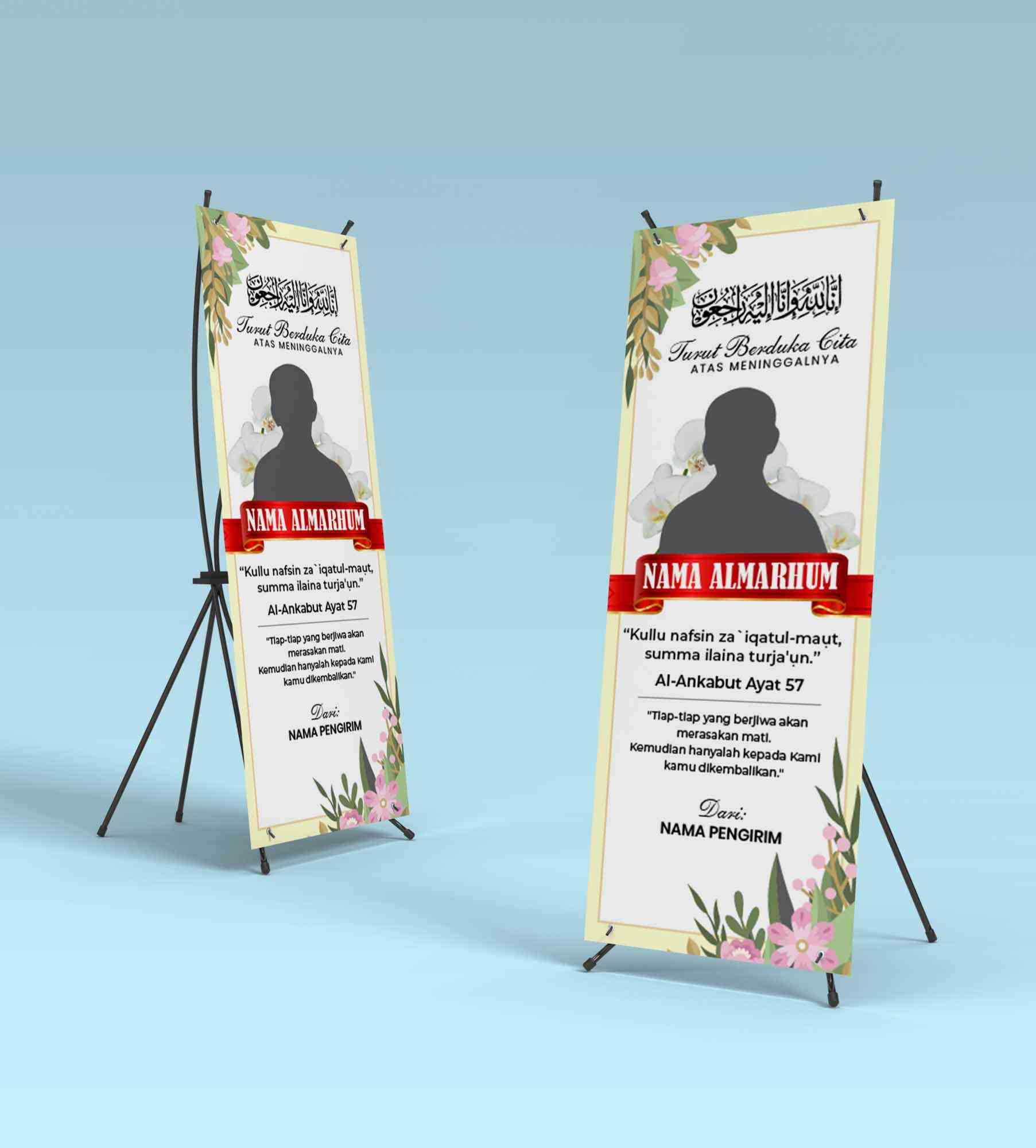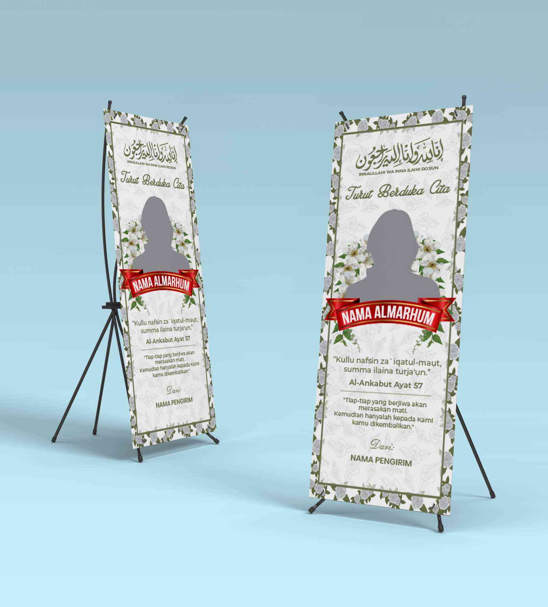 Tema "Kedamaian Abadi" mengusung nuansa yang tenang dan penuh penghormatan untuk mengenang kepergian seseorang dengan elegan dan damai. Banner ini dirancang untuk menciptakan suasana yang menghibur sekaligus penuh ketenangan, mencerminkan rasa duka cita yang mendalam dan doa untuk kedamaian abadi bagi almarhum/almarhumah.