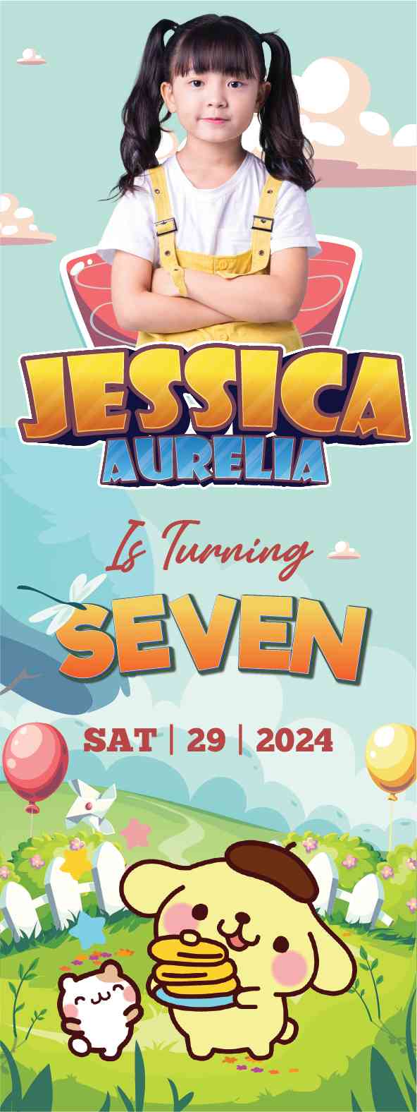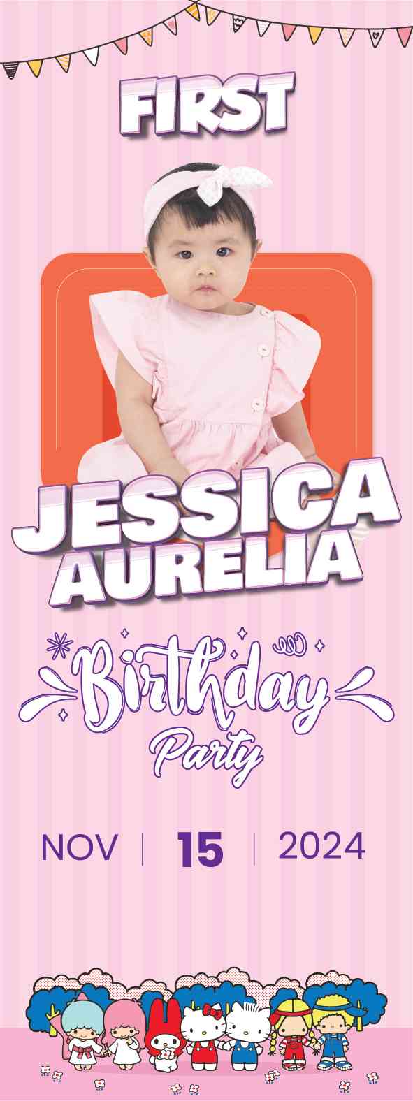 Standing banner ini hadir untuk memeriahkan hari istimewa [Nama Anak]. Dengan karakter-karakter ikonik seperti Hello Kitty, My Melody, dan teman-temannya, kita merayakan kebahagiaan dan keceriaan dalam nuansa yang penuh warna-warni!