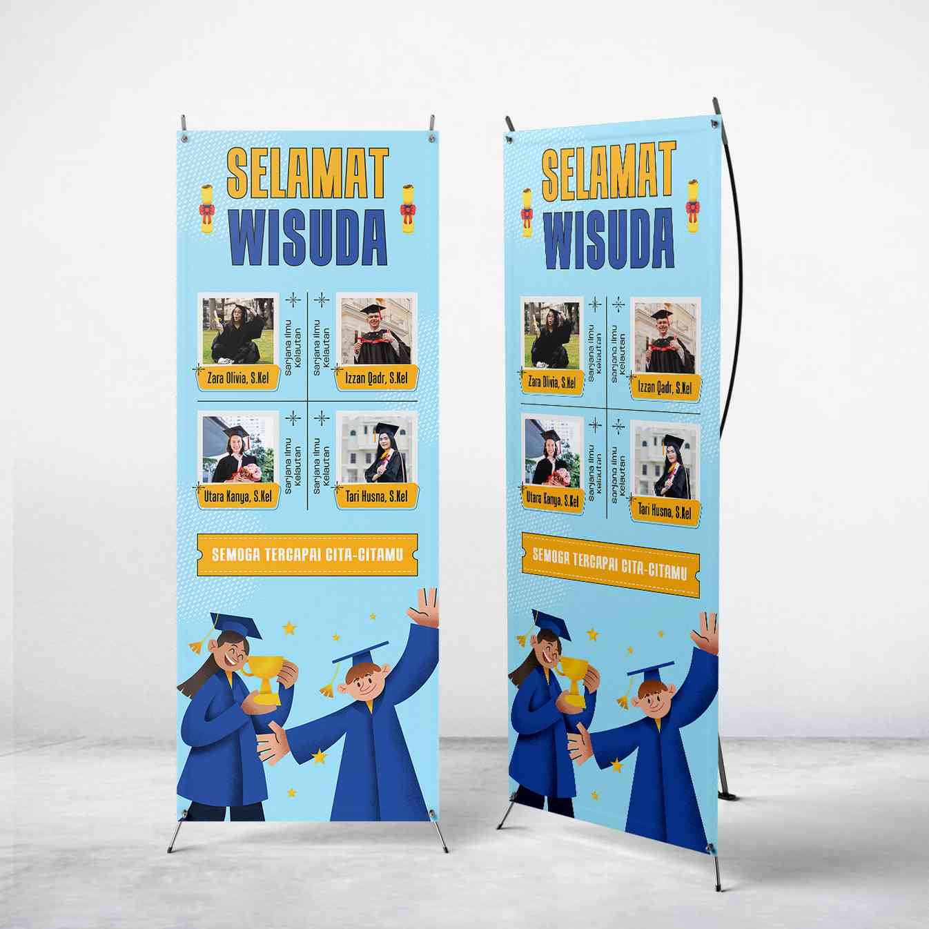 Desain standing banner ini memadukan warna biru elektrik dengan aksen kuning dan pink cerah, memberikan nuansa semangat dan kebanggaan yang sangat kuat dalam momen spesial kelulusan. Di bagian atas, terdapat elemen pita kuning dengan teks berulang "Selamat Wisuda dan Sukses", menciptakan atmosfer meriah seperti pesta perayaan. πβ¨ Banner ini menampilkan foto-foto wisudawan lengkap dengan nama, gelar, serta asal kelas atau jurusan, yang ditata dalam grid rapi dan mudah dibaca. Di bawahnya, teks besar "Selamat Sukses atas Wisudanya" tampil menonjol dengan variasi font modern yang membuat desain terlihat kekinian dan berkarakter.