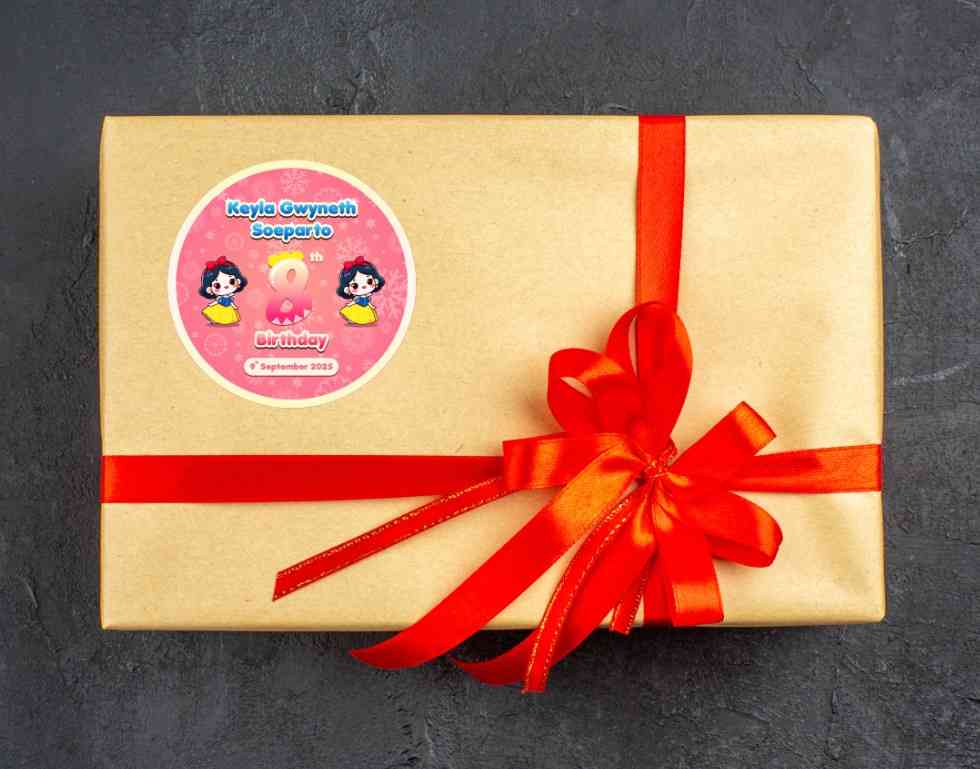 Sticker label ulang tahun anak berbentuk lingkaran ini didominasi warna pink dengan ilustrasi karakter Snow White bergaya kartun pada kedua sisi, meng...