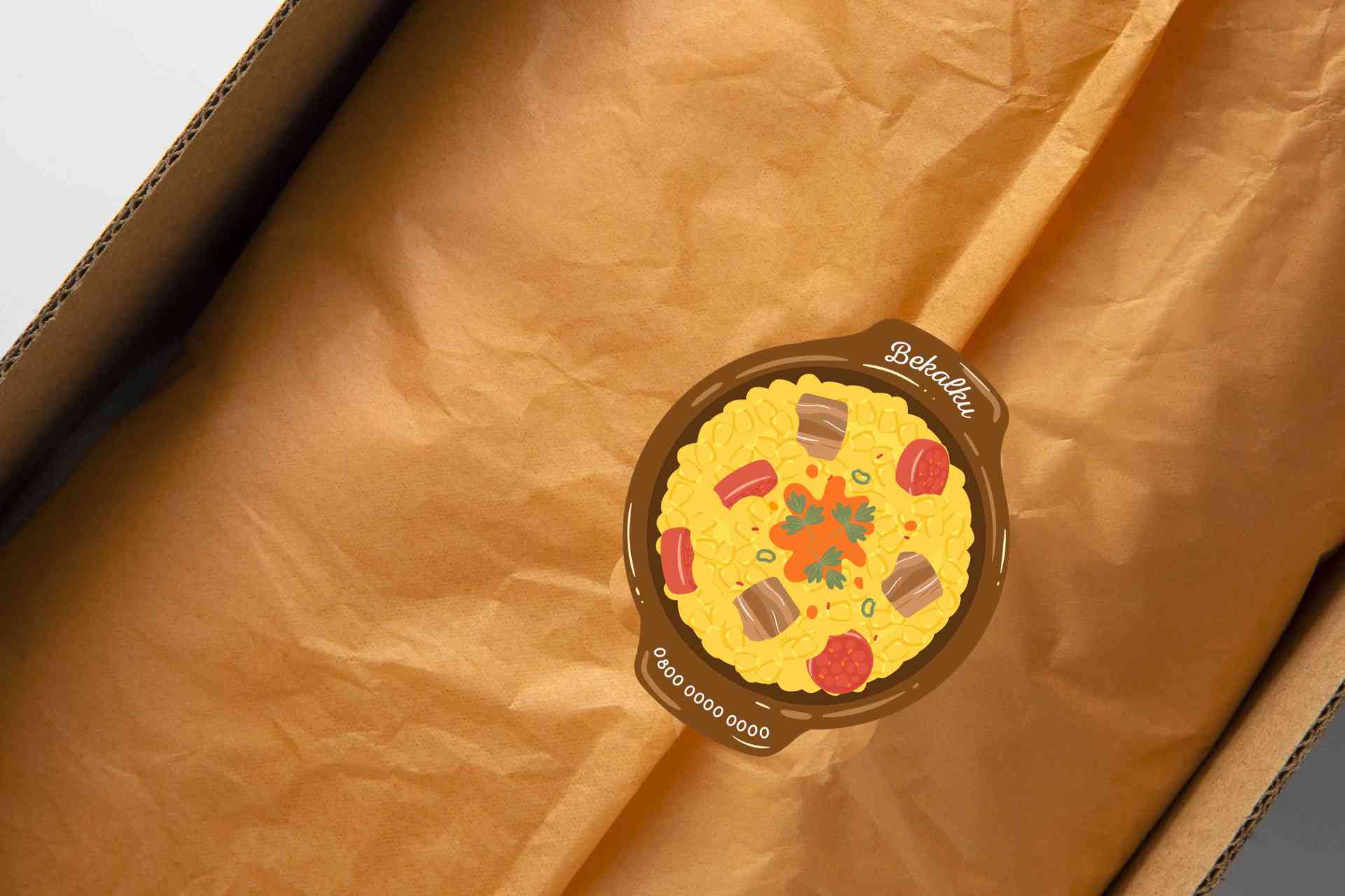 Sticker Bekalku memiliki bentuk bulat menyerupai piring makanan dengan ilustrasi nasi kuning, irisan sosis, daging, dan garnish daun di tengah sebagai...