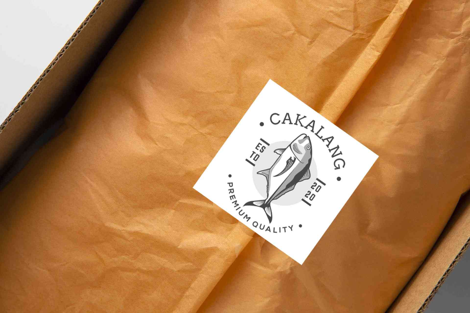Stiker makanan bertema “Cakalang Fish” ini berbentuk lingkaran dengan ilustrasi ikan cakalang bergaya monokrom yang menjadi karakter utama dan elemen...