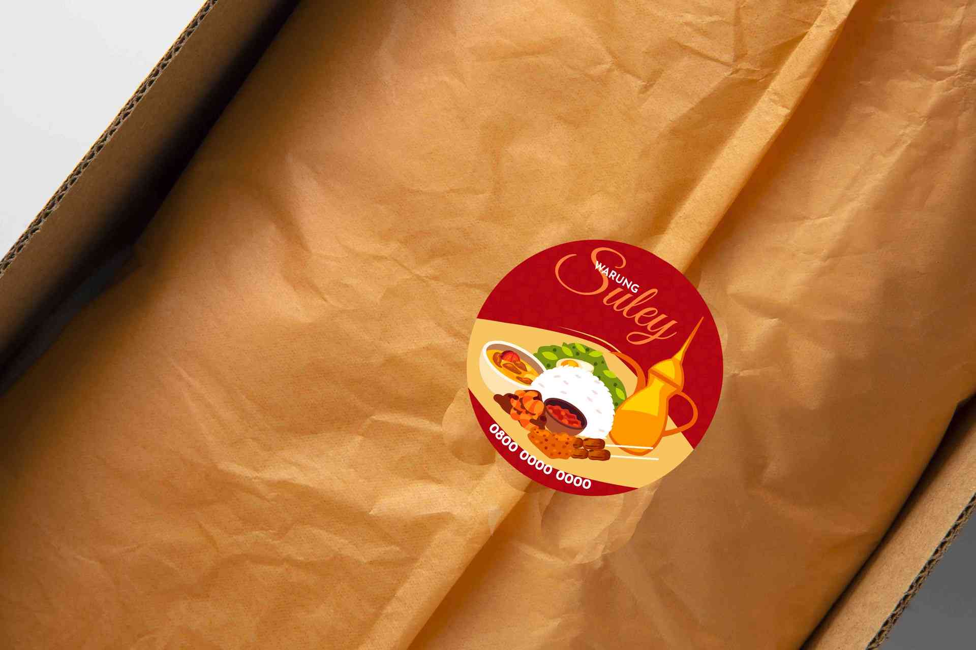 Stiker berbentuk lingkaran ini menampilkan judul “Warung Suley” dengan warna dominan merah yang menciptakan kesan hangat dan menarik. Bagian tengah me...