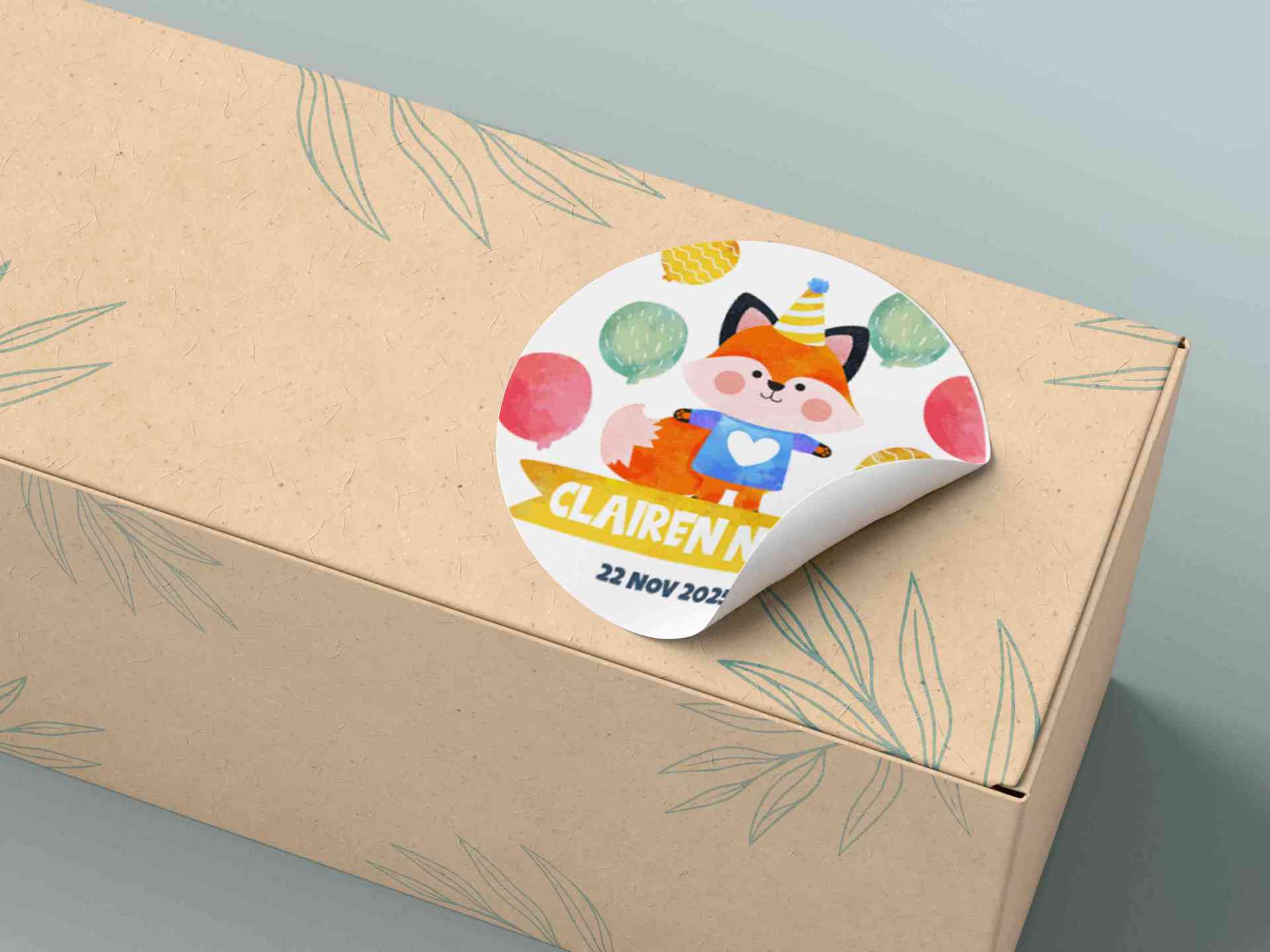 Sticker ulang tahun dengan tema rubah dan balon menampilkan karakter rubah lucu yang mengenakan topi pesta, berdiri di tengah dengan ekspresi ceria, d...