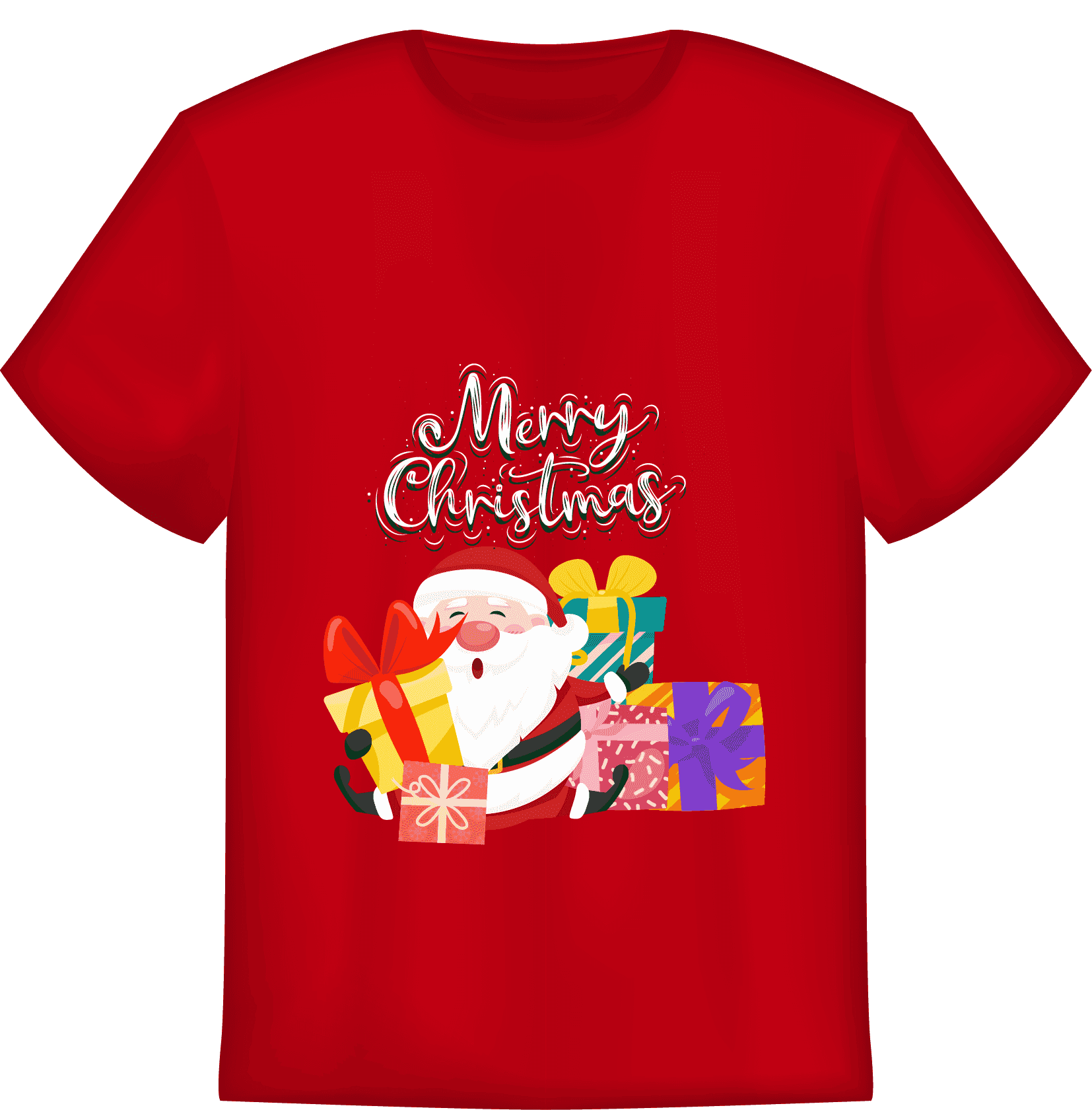 Kaos berwarna merah dengan desain utama karakter Santa Claus bergaya chibi yang sedang memegang beberapa kado berwarna-warni, di bawah tulisan dekorat...