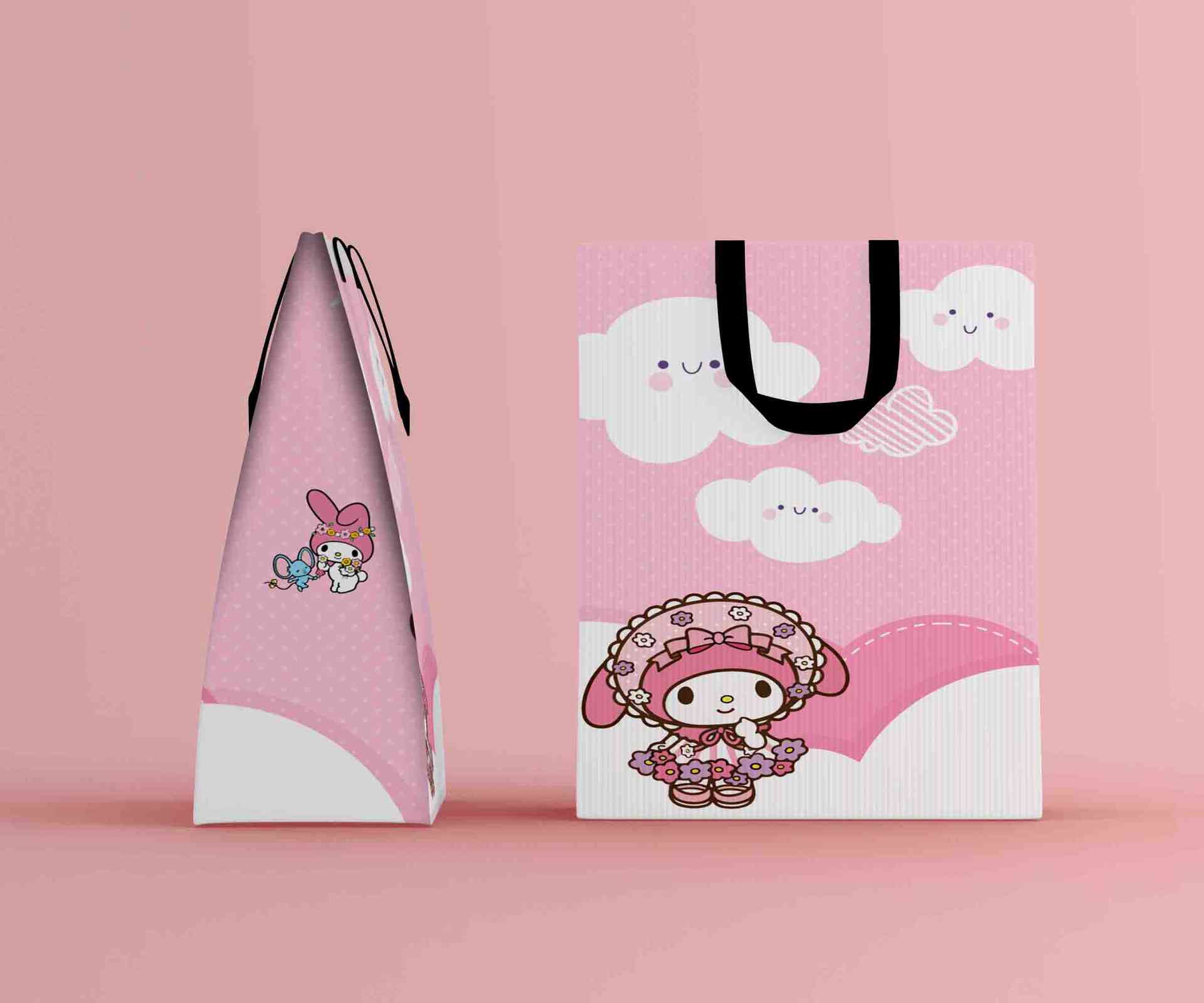 Paper bag ulang tahun dengan tema Melody Party tampil dalam bentuk kotak tegak, didominasi warna pink pastel dengan latar polkadot dan hiasan awan put...