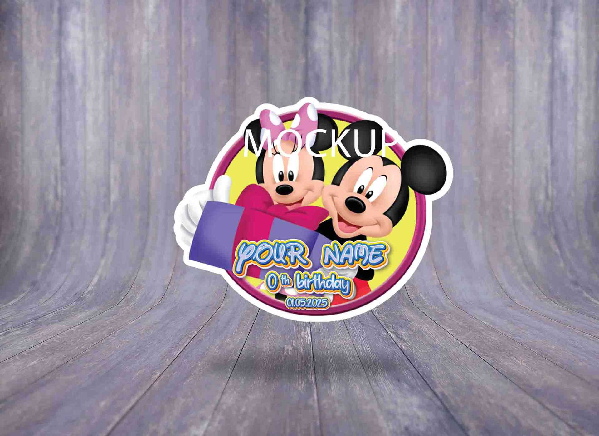 Stiker ini menampilkan ilustrasi ceria dari Mickey dan Minnie Mouse yang berdiri berdampingan, dikelilingi oleh elemen-elemen pesta. Font yang digunak...