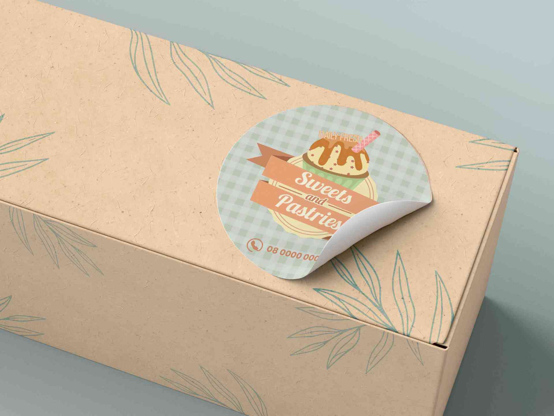 Stiker bulat ini menampilkan desain elegan dengan latar bergaris vertikal warna krem dan putih yang memberikan kesan bersih dan manis. Di bagian tengah terdapat ilustrasi cupcake cokelat dengan topping krim dan hiasan ceri merah yang mengundang selera. Tulisan Sweets & Pastries di atas pita merah muda melengkapi nuansa klasik dan homey, sementara teks Daily Fresh menegaskan kualitas produk yang selalu segar. Stiker ini cocok untuk branding kotak kue, roti, atau dessert homemade agar produk terlihat lebih menarik dan profesional.