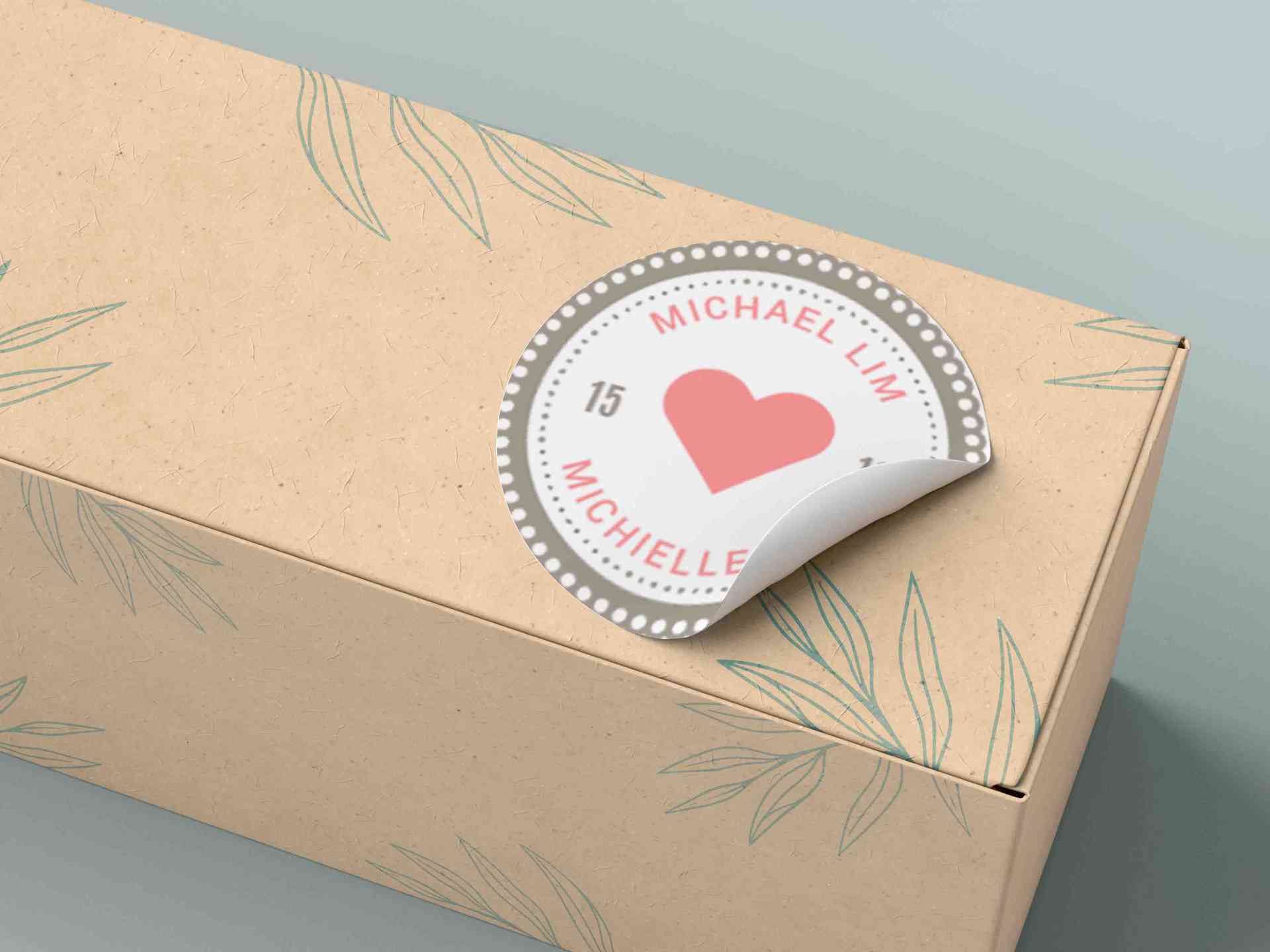 Desain stiker ini mengusung konsep minimalis romantis dengan format bulat dan border renda berlubang khas yang memberi sentuhan klasik. Di bagian teng...