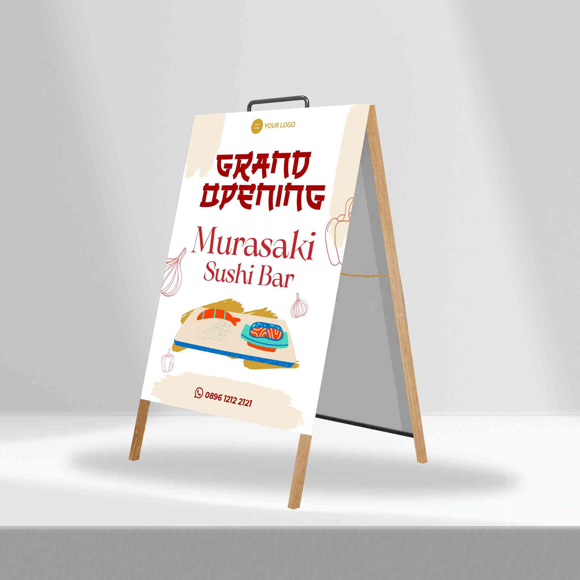 Triangle Stand Banner Kayu Opening Goldenya merupakan banner berbentuk segitiga dengan frame kayu, didesain khusus untuk promosi pembukaan restoran Go...
