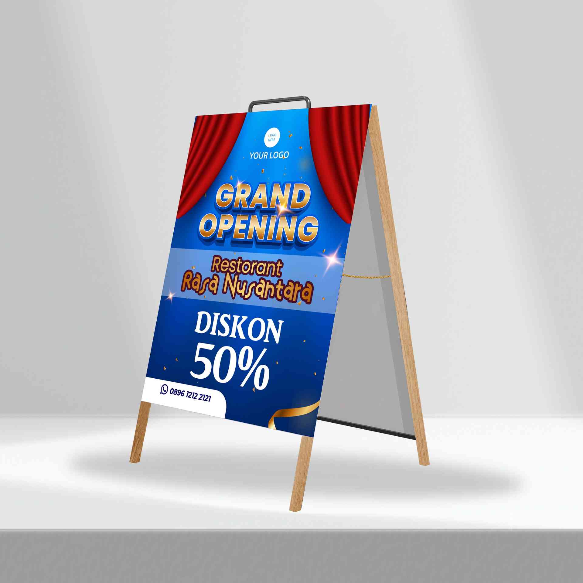 Triangle Stand Banner berbingkai kayu untuk event pembukaan restoran ini memiliki bentuk segitiga berdiri dengan muka utama berupa banner persegi panj...