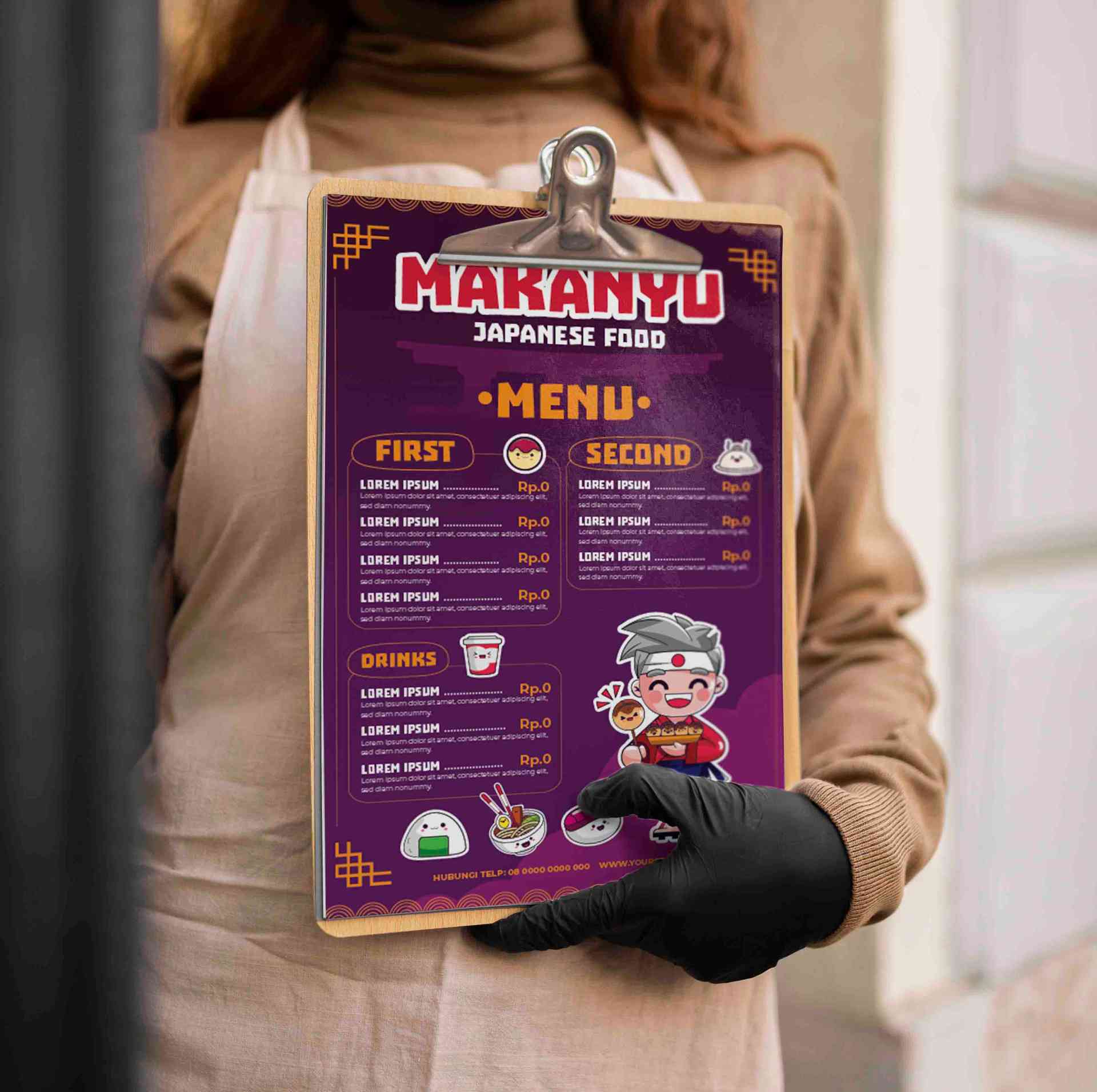 Menu makanan Japanese food dengan nuansa warna ungu ini berbentuk lembaran persegi panjang yang didominasi warna ungu tua dengan aksen kuning keemasan...