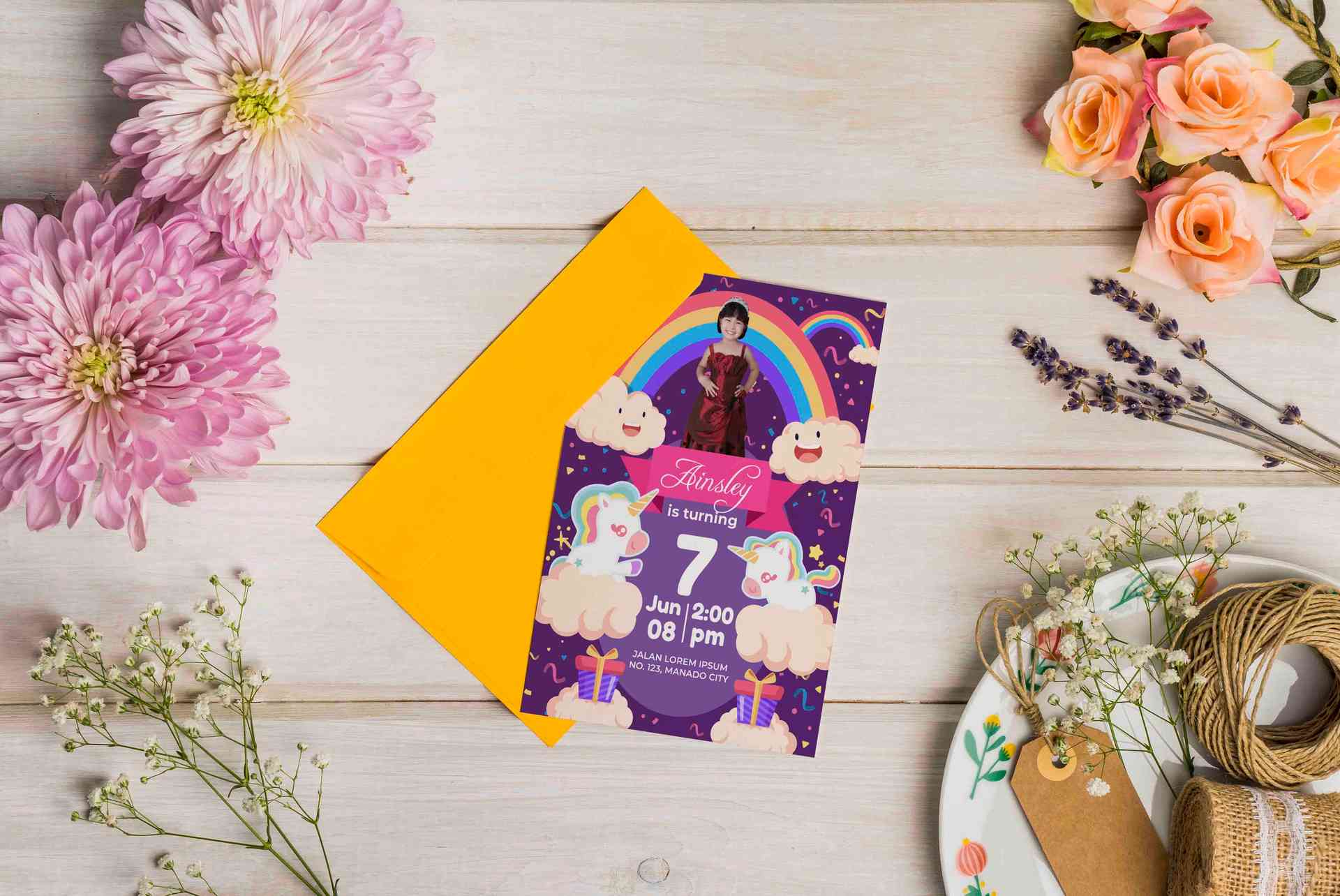 Undangan ulang tahun dengan tema unicorn awan ungu memiliki bentuk persegi panjang dengan warna dominan ungu dan dekorasi warna-warni seperti pelangi,...