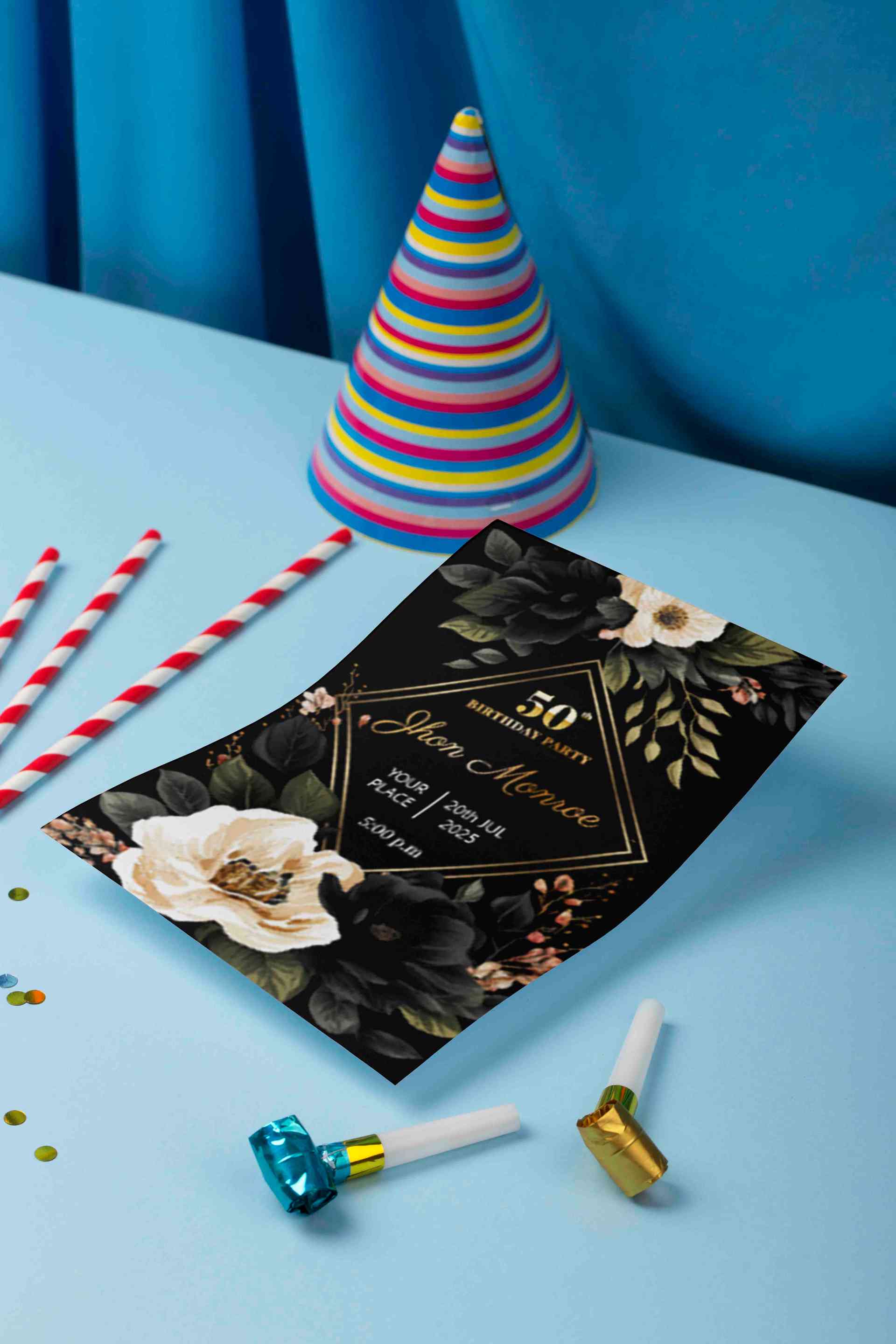 Undangan ulang tahun ini menampilkan desain elegan dan mewah dengan latar hitam pekat yang dihiasi rangkaian bunga mawar putih, hitam, dan daun hijau...