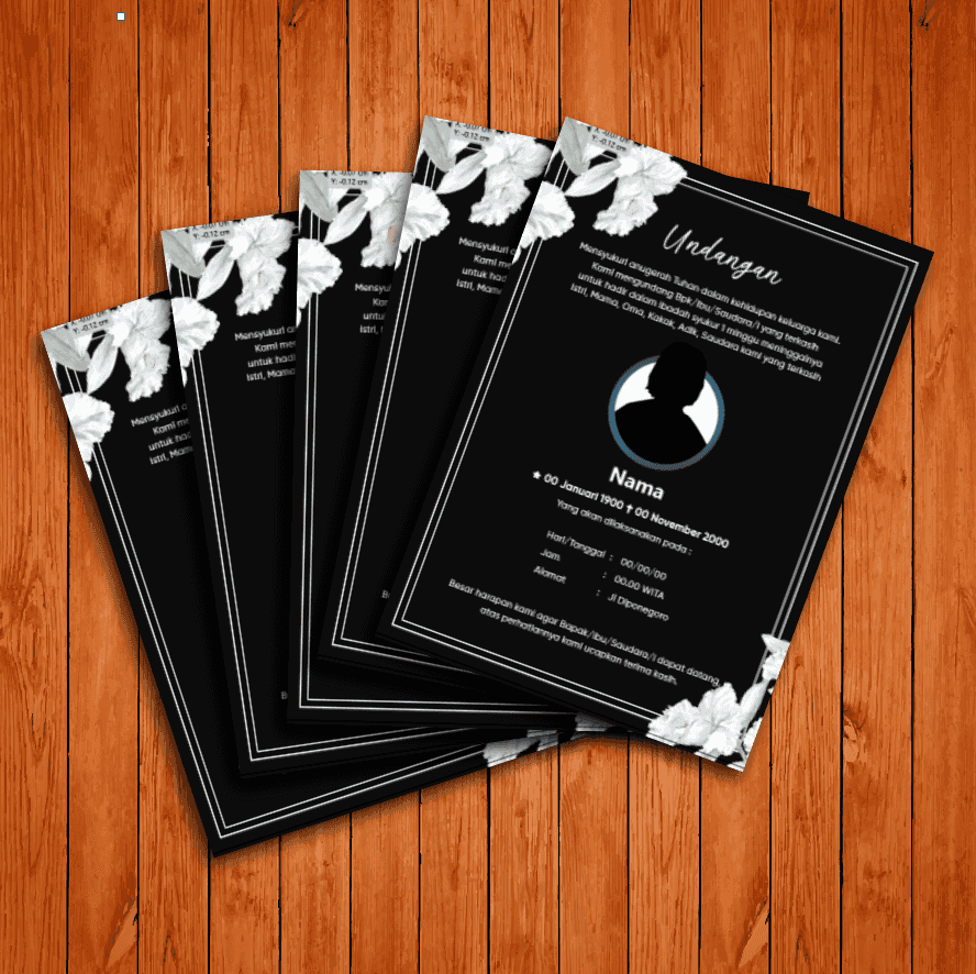 Undangan ibadah penghiburan dengan nuansa hitam elegan dan elemen bunga putih ini memberikan kesan khidmat, sopan, dan penuh penghormatan bagi almarhu...